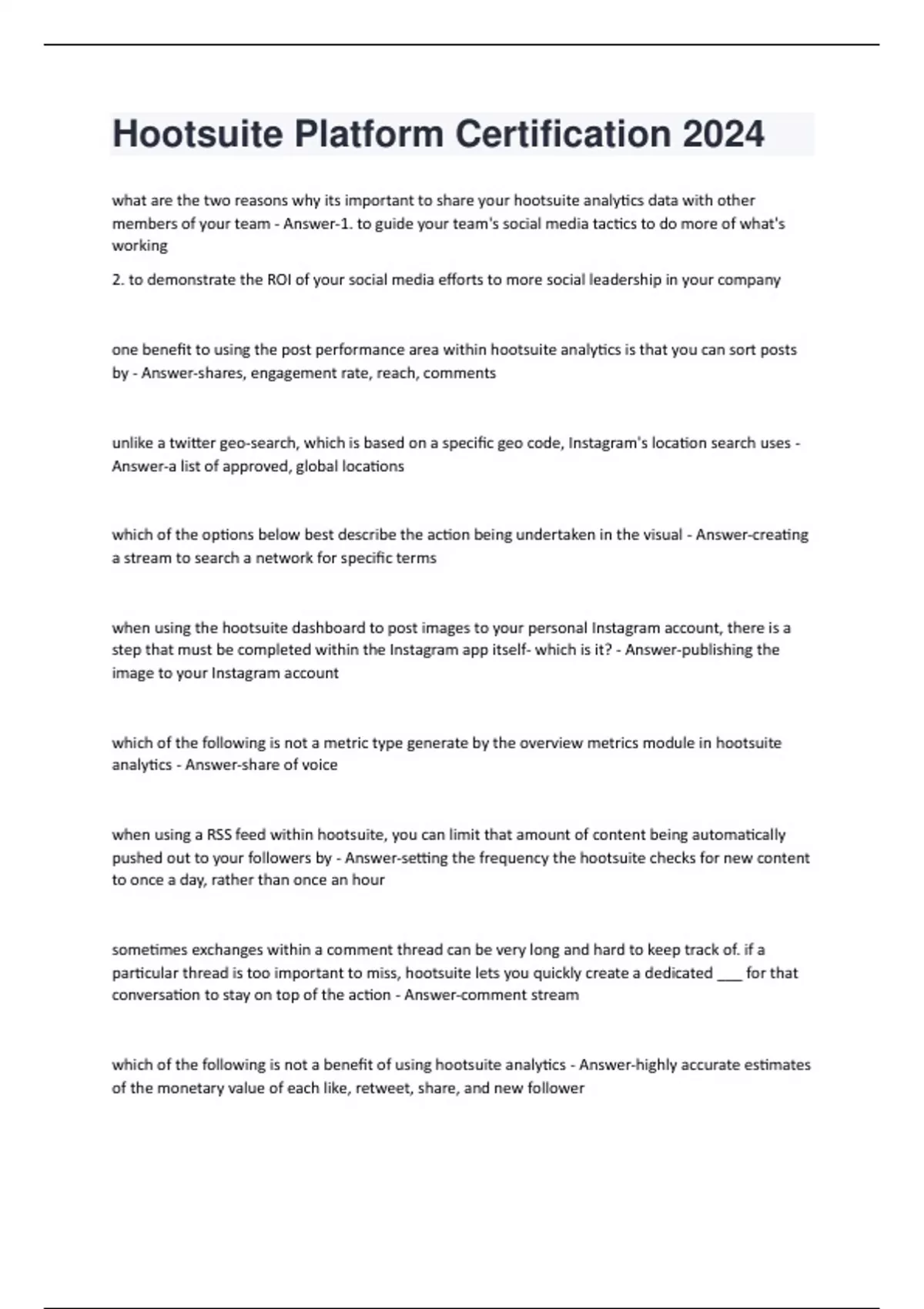 what are the two reasons why its important to share your hootsuite analytics data with other members of your team - Answer-1. to guide your team's social media tactics to do more of what's working 2. to demonstrate the ROI of your social media efforts to more social leadership in your company one benefit to using the post performance area within hootsuite analytics is that you can sort posts by - Answer-shares, engagement rate, reach, comments unlike a twitter geo-search, which is based on a specific geo code, Instagram's location search uses - Answer-a list of approved, global locations which of the options below best describe the action being undertaken in the visual - Answer-creating a stream to search a network for specific terms when using the hootsuite dashboard to post images to your personal Instagram account, there is a step that must be completed within the Instagram app itself- which is it? - Answer-publishing the image to your Instagram account which of the following is not a metric type generate by the overview metrics module in hootsuite analytics - Answer-share of voice when using a RSS feed within hootsuite, you can limit that amount of content being automatically pushed out to your followers by - Answer-setting the frequency the hootsuite checks for new content to once a day, rather than once an hour sometimes exchanges within a comment thread can be very long and hard to keep track of. if a particular thread is too important to miss, hootsuite lets you quickly create a dedicated ___ for that conversation to stay on top of the action - Answer-comment stream which of the following is not a benefit of using hootsuite analytics - Answer-highly accurate estimates of the monetary value of each like, retweet, share, and new followerwhat are the two best practices for discovering whether a message you've scheduled with hootsuite has failed to send - Answer-enable email notifications for failed messages under "preferences", review the " past scheduled" calendar view in publisher for entries colored red when using the hootsuite planner feature, the fastest way to compose a new message is to - Answerclick on a time slot and choose new post/new pin in the composer, there are 3 ways you can attach an image, which of the following is not an option for attaching an image - Answer-insert an image from an instream tweet unlike the overview module in hootsuite analytics, which offers one set of aggregated analytics data, ___ allows you to run an unlimited number of customizable and shareable real-time analytics reports, dialed precisely to the diverse reporting needs of your organization - Answer-the reports feature when using hootsuite to publish to Instagram there are some types of posts that require using the "mobile notification workflow" which involves a few additional steps. pick the post type below that does not require using the "mobile notification workflow" - Answer-image posted to a business account its important to ensure you've done the following steps when scheduling messages using the hootsuite bulk compose feature - Answer-input the date in month, day, year or day, month, year formant ensure you use a 24-hour clock format conversations on twitter move fast and it's easy to miss the opportunity to engage with an important influencer or prospect. ___ are a great way to group together similar people and topics in twitter so you can focus on activity within a group without distractions - Answer-twitter lists within a hootsuite analytics report, you can add a tile, which is : - Answer-an individual display of a specific metric a vanity URL in hootsuite is best described as: - Answer-a customizable, branded URL that also lets you track click-through statisticswhen onboarding new team members in hootsuite analytics we recommend ____ to reduce the risk that something is changed incorrectly or accidently - Answer-sharing reports in read only form after you've uploaded messages into hootsuite using the bulk compose feature, where would you go to review and make edits to those messages - Answer-planner hootsuite publisher is an area of the dashboard that gives social media managers: - Answer-the ability to schedule posts to multiple networks, and then review, revise, rearrange, and export them when using composer, what's the purpose of the social profile picker - Answer-to select the social profiles to which you want to publish your message