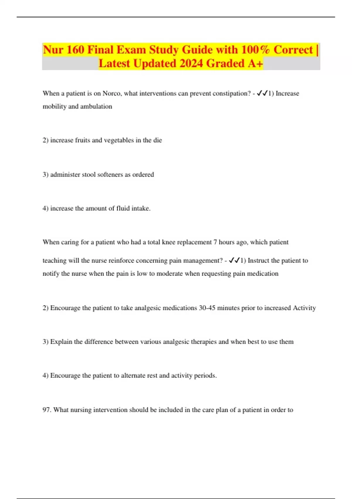 Nur 160 Final Exam Study Guide with 100% Correct | Latest Updated 2024 Graded A+ When a patient is on Norco, what interventions can prevent constipation? - 1) Increase mobility and ambulation 2) increase fruits and vegetables in the die 3) administer stool softeners as ordered 4) increase the amount of fluid intake. When caring for a patient who had a total knee replacement 7 hours ago, which patient teaching will the nurse reinforce concerning pain management? - 1) Instruct the patient to notify the nurse when the pain is low to moderate when requesting pain medication 2) Encourage the patient to take analgesic medications 30-45 minutes prior to increased Activity 3) Explain the difference between various analgesic therapies and when best to use them 4) Encourage the patient to alternate rest and activity periods. 97. What nursing intervention should be included in the care plan of a patient in order to