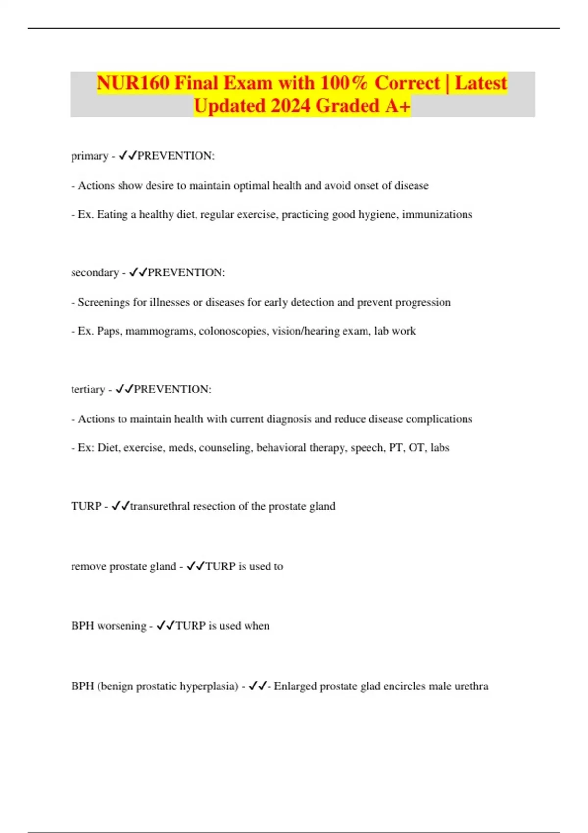 NUR160 Final Exam with 100% Correct | Latest Updated 2024 Graded A+ primary - PREVENTION: - Actions show desire to maintain optimal health and avoid onset of disease - Ex. Eating a healthy diet, regular exercise, practicing good hygiene, immunizations secondary - PREVENTION: - Screenings for illnesses or diseases for early detection and prevent progression - Ex. Paps, mammograms, colonoscopies, vision/hearing exam, lab work tertiary - PREVENTION: - Actions to maintain health with current diagnosis and reduce disease complications - Ex: Diet, exercise, meds, counseling, behavioral therapy, speech, PT, OT, labs TURP - transurethral resection of the prostate gland remove prostate gland - TURP is used to BPH worsening - TURP is used when BPH (benign prostatic hyperplasia) - - Enlarged prostate glad encircles male urethra