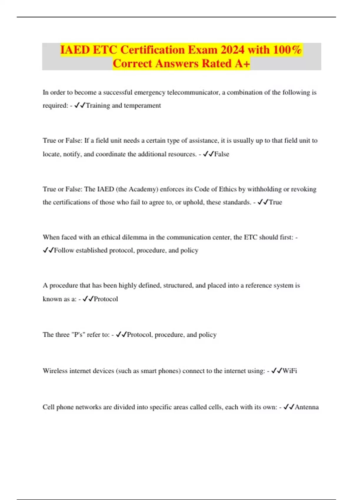 IAED ETC Certification Exam 2024 with 100% Correct Answers Rated A+ In order to become a successful emergency telecommunicator, a combination of the following is required: - Training and temperament True or False: If a field unit needs a certain type of assistance, it is usually up to that field unit to locate, notify, and coordinate the additional resources. - False True or False: The IAED (the Academy) enforces its Code of Ethics by withholding or revoking the certifications of those who fail to agree to, or uphold, these standards. - True When faced with an ethical dilemma in the communication center, the ETC should first: - Follow established protocol, procedure, and policy A procedure that has been highly defined, structured, and placed into a reference system is known as a: - Protocol The three "P's" refer to: - Protocol, procedure, and policy Wireless internet devices (such as smart phones) connect to the internet using: - WiFi Cell phone networks are divided into specific areas called cells, each with its own: - Antenna