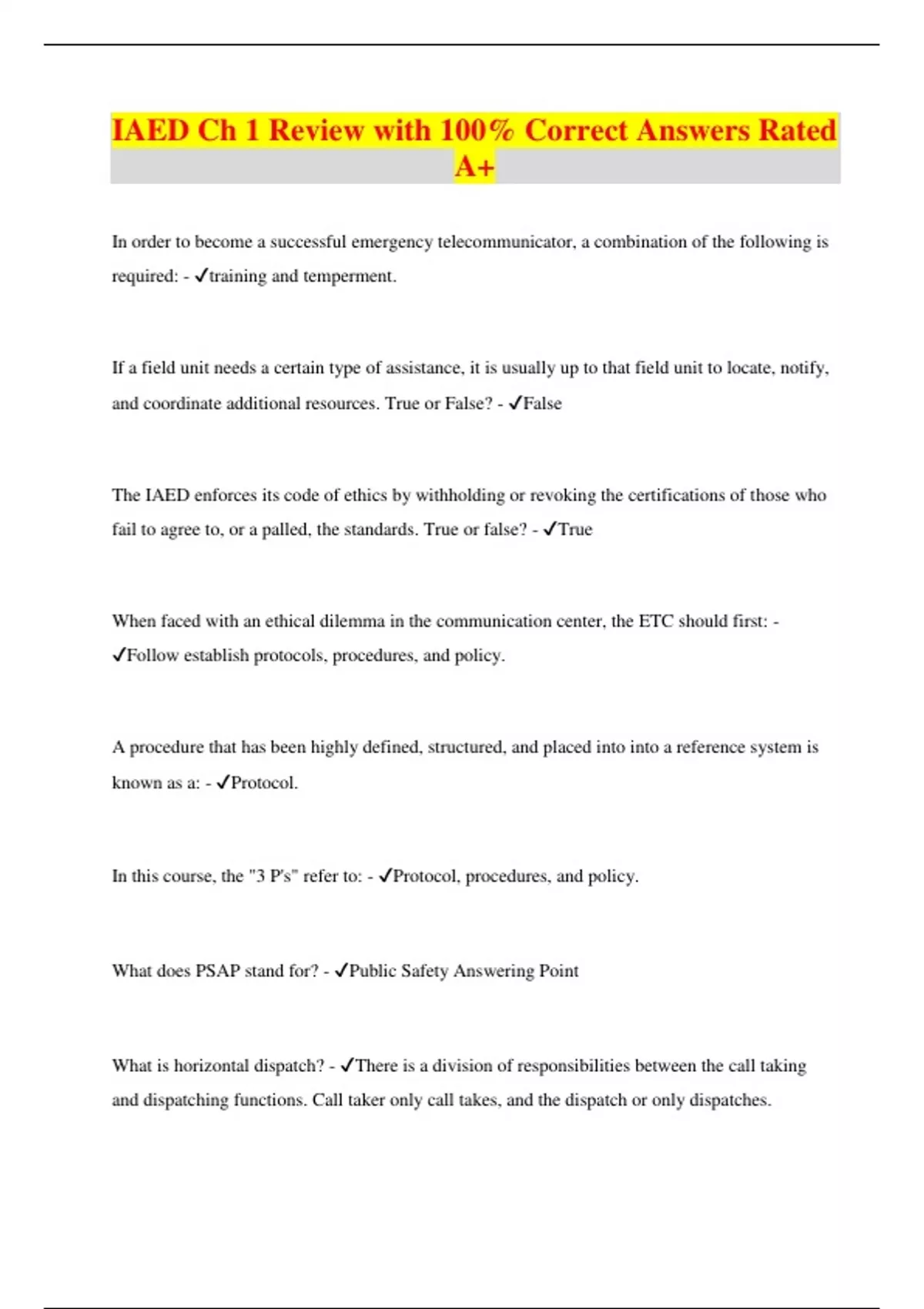 IAED Ch 1 Review with 100% Correct Answers Rated A+ In order to become a successful emergency telecommunicator, a combination of the following is required: - training and temperment. If a field unit needs a certain type of assistance, it is usually up to that field unit to locate, notify, and coordinate additional resources. True or False? - False The IAED enforces its code of ethics by withholding or revoking the certifications of those who fail to agree to, or a palled, the standards. True or false? - True When faced with an ethical dilemma in the communication center, the ETC should first: - Follow establish protocols, procedures, and policy. A procedure that has been highly defined, structured, and placed into into a reference system is known as a: - Protocol. In this course, the "3 P's" refer to: - Protocol, procedures, and policy. What does PSAP stand for? - Public Safety Answering Point What is horizontal dispatch? - There is a division of responsibilities between the call taking and dispatching functions. Call taker only call takes, and the dispatch or only dispatches.