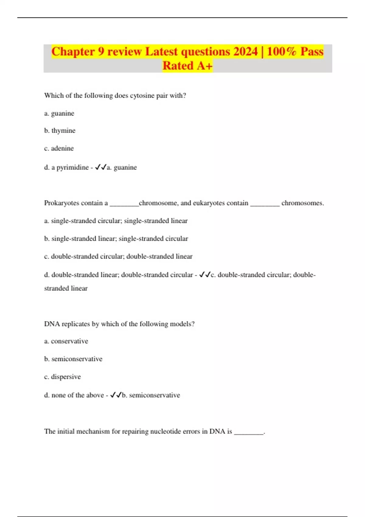 Chapter 9 review Latest questions 2024 | 100% Pass Rated A+ Which of the following does cytosine pair with? a. guanine b. thymine c. adenine d. a pyrimidine - a. guanine Prokaryotes contain a ________chromosome, and eukaryotes contain ________ chromosomes. a. single-stranded circular; single-stranded linear b. single-stranded linear; single-stranded circular c. double-stranded circular; double-stranded linear d. double-stranded linear; double-stranded circular - c. double-stranded circular; doublestranded linear DNA replicates by which of the following models? a. conservative b. semiconservative c. dispersive d. none of the above - b. semiconservative