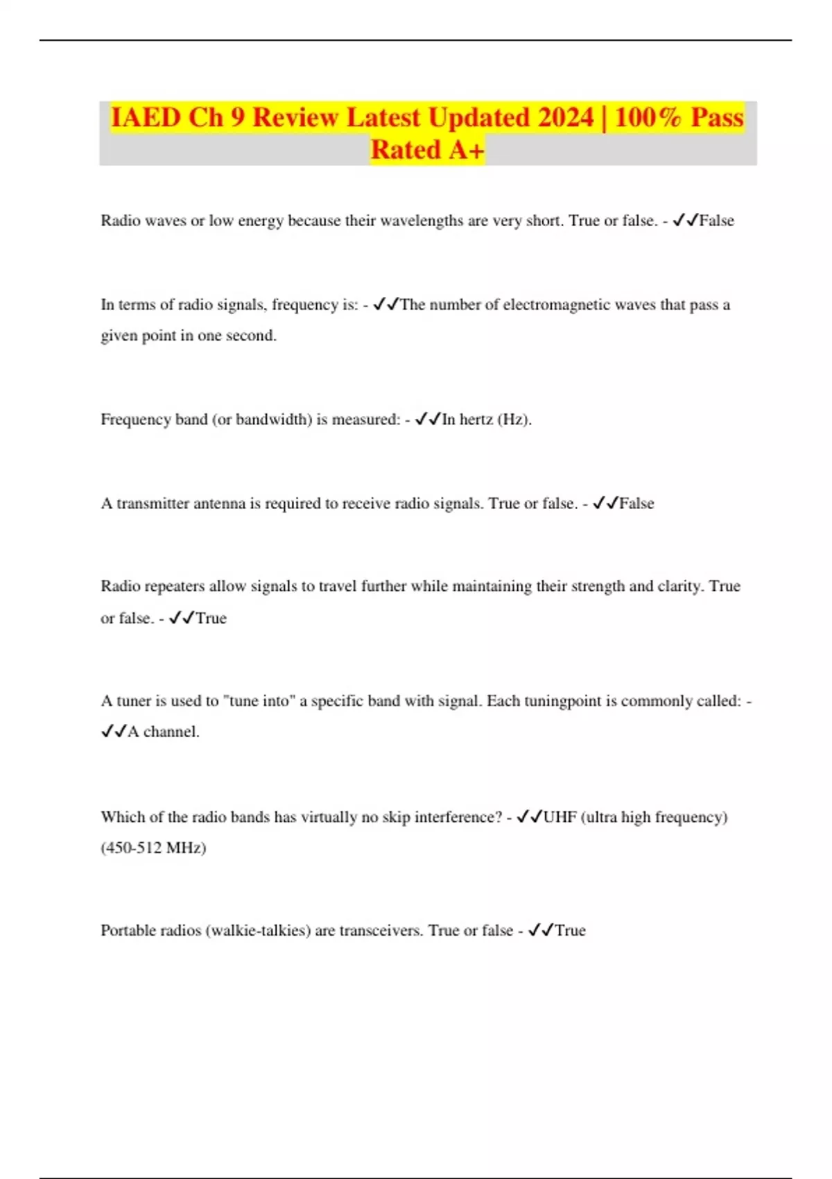 IAED Ch 9 Review Latest Updated 2024 | 100% Pass Rated A+ Radio waves or low energy because their wavelengths are very short. True or false. - False In terms of radio signals, frequency is: - The number of electromagnetic waves that pass a given point in one second. Frequency band (or bandwidth) is measured: - In hertz (Hz). A transmitter antenna is required to receive radio signals. True or false. - False Radio repeaters allow signals to travel further while maintaining their strength and clarity. True or false. - True A tuner is used to "tune into" a specific band with signal. Each tuningpoint is commonly called: - A channel. Which of the radio bands has virtually no skip interference? - UHF (ultra high frequency) (450-512 MHz) Portable radios (walkie-talkies) are transceivers. True or false - True