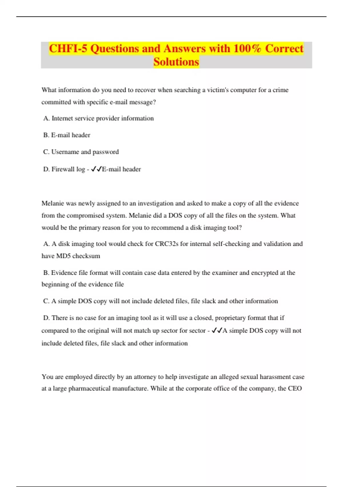 CHFI-5 Questions and Answers with 100% Correct Solutions What information do you need to recover when searching a victim's computer for a crime committed with specific e-mail message? A. Internet service provider information B. E-mail header C. Username and password D. Firewall log - E-mail header Melanie was newly assigned to an investigation and asked to make a copy of all the evidence from the compromised system. Melanie did a DOS copy of all the files on the system. What would be the primary reason for you to recommend a disk imaging tool? A. A disk imaging tool would check for CRC32s for internal self-checking and validation and have MD5 checksum B. Evidence file format will contain case data entered by the examiner and encrypted at the beginning of the evidence file C. A simple DOS copy will not include deleted files, file slack and other information D. There is no case for an imaging tool as it will use a closed, proprietary format that if compared to the original will not match up sector for sector - A simple DOS copy will not include deleted files, file slack and other information