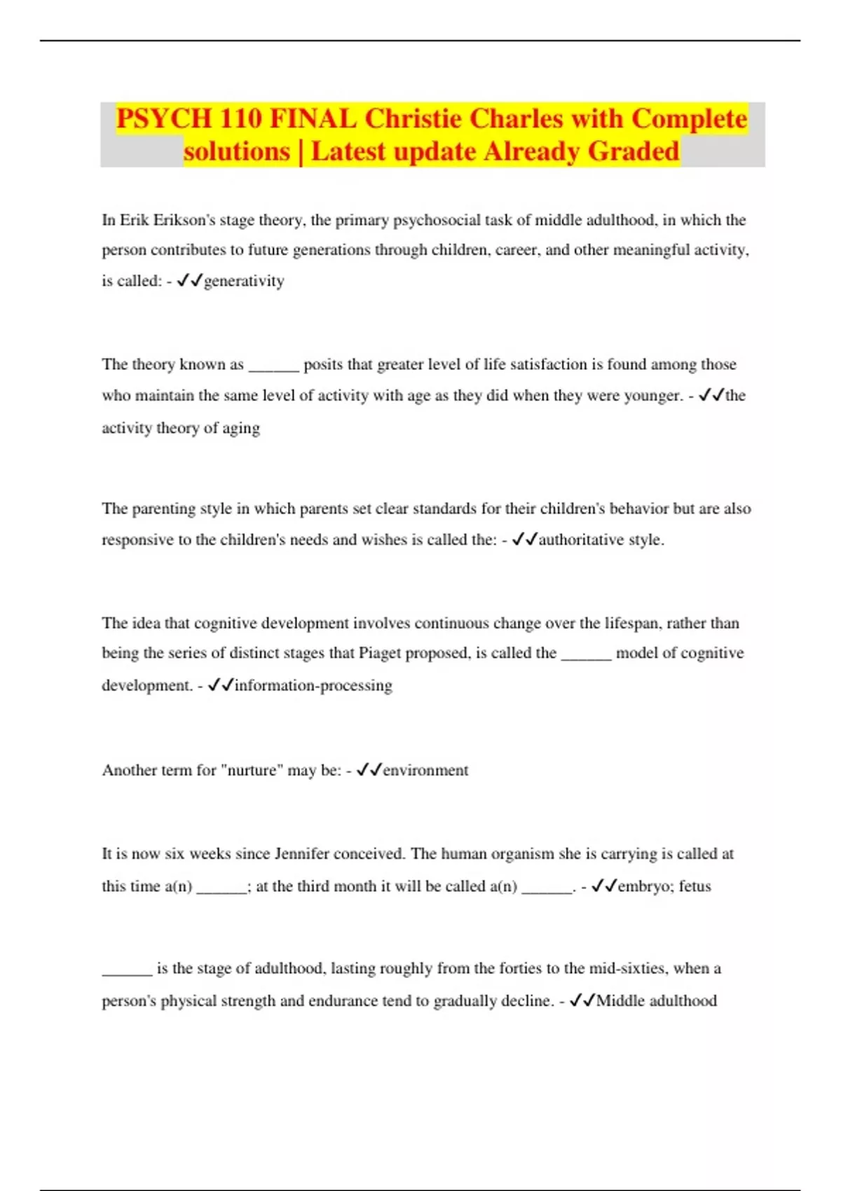 PSYCH 110 FINAL Christie Charles with Complete solutions | Latest update Already Graded In Erik Erikson's stage theory, the primary psychosocial task of middle adulthood, in which the person contributes to future generations through children, career, and other meaningful activity, is called: - generativity The theory known as ______ posits that greater level of life satisfaction is found among those who maintain the same level of activity with age as they did when they were younger. - the activity theory of aging The parenting style in which parents set clear standards for their children's behavior but are also responsive to the children's needs and wishes is called the: - authoritative style. The idea that cognitive development involves continuous change over the lifespan, rather than being the series of distinct stages that Piaget proposed, is called the ______ model of cognitive development. - information-processing Another term for "nurture" may be: - environment