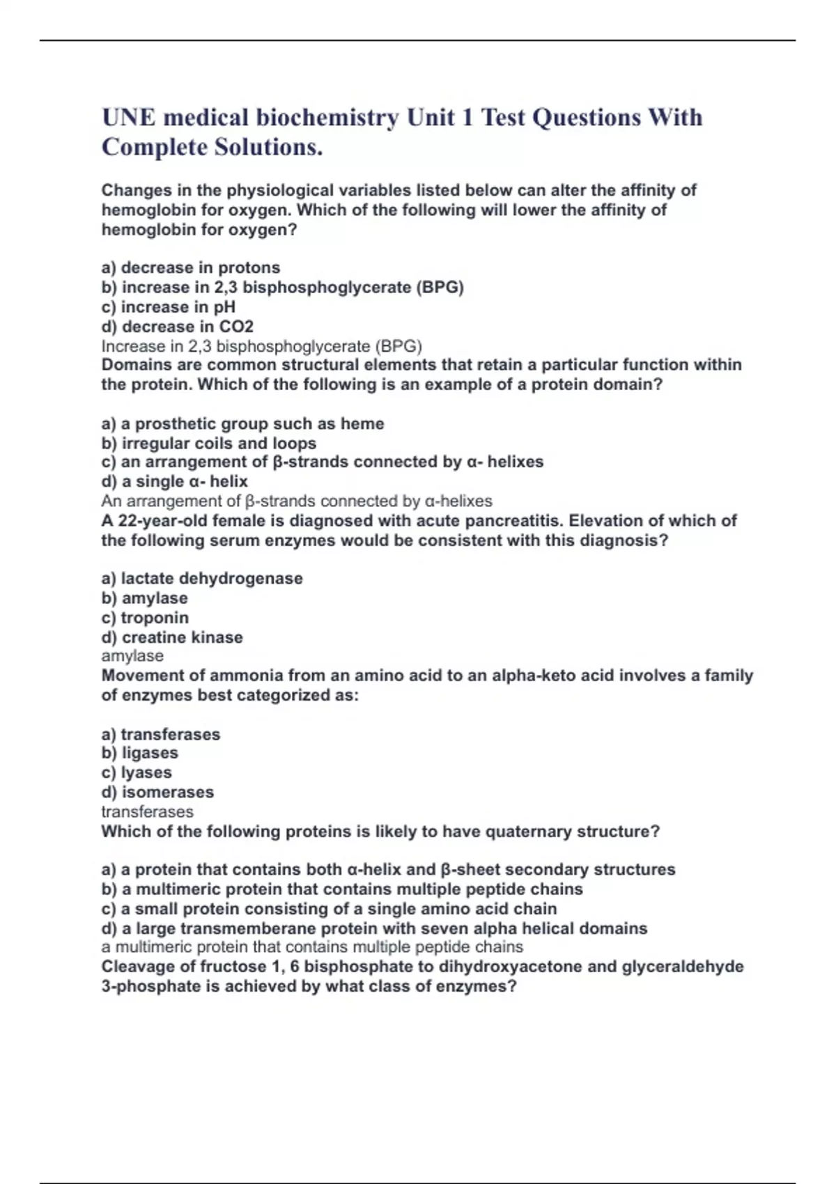 UNE medical biochemistry Unit 1 Test Questions With Complete Solutions. Changes in the physiological variables listed below can alter the affinity of hemoglobin for oxygen. Which of the following will lower the affinity of hemoglobin for oxygen? a) decrease in protons b) increase in 2,3 bisphosphoglycerate (BPG) c) increase in pH d) decrease in CO2 Increase in 2,3 bisphosphoglycerate (BPG) Domains are common structural elements that retain a particular function within the protein. Which of the following is an example of a protein domain? a) a prosthetic group such as heme b) irregular coils and loops c) an arrangement of β-strands connected by α- helixes d) a single α- helix An arrangement of β-strands connected by α-helixes A 22-year-old female is diagnosed with acute pancreatitis. Elevation of which of the following serum enzymes would be consistent with this diagnosis? a) lactate dehydrogenase b) amylase c) troponin d) creatine kinase amylase Movement of ammonia from an amino acid to an alpha-keto acid involves a family of enzymes best categorized as: a) transferases b) ligases c) lyases d) isomerases transferases Which of the following proteins is likely to have quaternary structure? a) a protein that contains both α-helix and β-sheet secondary structures b) a multimeric protein that contains multiple peptide chains c) a small protein consisting of a single amino acid chain d) a large transmemberane protein with seven alpha helical domains a multimeric protein that contains multiple peptide chains Cleavage of fructose 1, 6 bisphosphate to dihydroxyacetone and glyceraldehyde 3-phosphate is achieved by what class of enzymes? a) ligase b) lyase c) transferase d) hydrolase Lyase Which of the following best describes the structure of heme? a) a planar porphyrin ring that binds iron b) a nicotinamide structure that is readily oxidized c) an n-linked glycosylation d) a negatively charged phosphate group a planar porphyrin ring that binds iron Prosthetic groups are complex nonprotein molecules that participate in catalysis by providing functional groups that form a covalent intermediate between the enzyme and the substrate. Which of the following is an example of a coenzyme or cofactor that participates in a covalent catalysis reaction? a) ATP b) OH- c) NADH d) pyridoxal phosphate pyridoxal phsophate Which of the following best describes tertiary structure? a) interactions between differing subunits of a protein b) interactions between α-helixes and β-pleated sheets to form a domain c) interactions between amino acids 4 residues away from each other d) interactions between single amino acids adjacent to one another interactions between α-helixes and β-pleated sheets to form a domain Hemoglobin bound to heme is termed a holoprotein. The heme is required for oxygen binding and is defined as which of the following? a) apoprotein b) holoprotein c) heteroprotein d) prosthetic group prosthetic group Children with cystinosis have growth delay and renal issues to to accumulation of cysteine in cellular lysosomes. The defect involves a specific lysosomal membrane receptor that facilitates cysteine removal from the cell. An effective therapy involves administration of a drug with a similar structure to cysteine. This therapy reflects the general principle that competitive inhibitors typically resemble the structure of which of the following? a) substrates or ligands that bind the active site