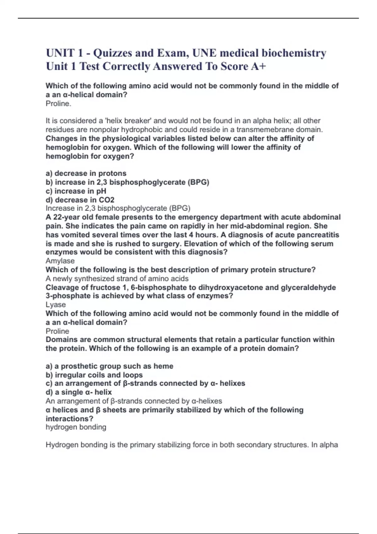 UNIT 1 - Quizzes and Exam, UNE medical biochemistry Unit 1 Test Correctly Answered To Score A+ Which of the following amino acid would not be commonly found in the middle of a an α-helical domain? Proline. It is considered a 'helix breaker' and would not be found in an alpha helix; all other residues are nonpolar hydrophobic and could reside in a transmemebrane domain. Changes in the physiological variables listed below can alter the affinity of hemoglobin for oxygen. Which of the following will lower the affinity of hemoglobin for oxygen? a) decrease in protons b) increase in 2,3 bisphosphoglycerate (BPG) c) increase in pH d) decrease in CO2 Increase in 2,3 bisphosphoglycerate (BPG) A 22-year old female presents to the emergency department with acute abdominal pain. She indicates the pain came on rapidly in her mid-abdominal region. She has vomited several times over the last 4 hours. A diagnosis of acute pancreatitis is made and she is rushed to surgery. Elevation of which of the following serum enzymes would be consistent with this diagnosis? Amylase Which of the following is the best description of primary protein structure? A newly synthesized strand of amino acids Cleavage of fructose 1, 6-bisphosphate to dihydroxyacetone and glyceraldehyde 3-phosphate is achieved by what class of enzymes? Lyase Which of the following amino acid would not be commonly found in the middle of a an α-helical domain? Proline Domains are common structural elements that retain a particular function within the protein. Which of the following is an example of a protein domain? a) a prosthetic group such as heme b) irregular coils and loops c) an arrangement of β-strands connected by α- helixes d) a single α- helix An arrangement of β-strands connected by α-helixes α helices and β sheets are primarily stabilized by which of the following interactions? hydrogen bonding Hydrogen bonding is the primary stabilizing force in both secondary structures. In alpha helices the hydrogen bond is between the carbonyl oxygen group from one peptide bond and that amide hydrogen from a different peptide bond approximately amide 4 resides down in the helix. In beta sheets, the hydrogen bonding is between the carbonyl oxygen and the amide hydrogen from different peptide strands. Compare and contrast beta sheets and alpha helical formations. (Figure 7.3 vs. 7.5) Phosphorylation of an amino acid changes the charge on the residue to: Negative The addition of a phospho group will add a large negative moiety to the amino acid and change the functionality of the protein. Which of the following amino acid would not be commonly found in the middle of a an α-helical domain? Proline A 55-year old man is brought to the emergency room with a chief complaint of chest pain and tingling in his left arm. Elevation of which of the following enzymes in circulation would be most indicative of a myocardial infarction? Troponin A 22-year-old female is diagnosed with acute pancreatitis. Elevation of which of the following serum enzymes would be consistent with this diagnosis? a) lactate dehydrogenase b) amylase c) troponin d) creatine kinase amylase Hemoglobin binds oxygen with a greater affinity in the: R-State --- Hemoglobin binds oxygen with a greater affinity in the R state. As oxygen binds each subunit, the affinity for oxygen increases; this is termed cooperative binding. A 19-year-old boy is diagnosed with Creutzfeldt-Jakob Disease which is caused by the introduction of an amyloid fold in the disease-causing protein. The introduction of this fold causes the protein to transition from a primarily α-helical structure to an aggregate of mostly β-sheets. This change in protein structure (leading to disease) is best attributed to changes in which of the following? Folding of the secondary structures α-helices and β-sheets are primarily stabilized by which of the following interactions Hydrogen bonding Movement of ammonia from an amino acid to an alpha-keto acid involves a family of enzymes best categorized as: a) transferases b) ligases c) lyases d) isomerases transferases