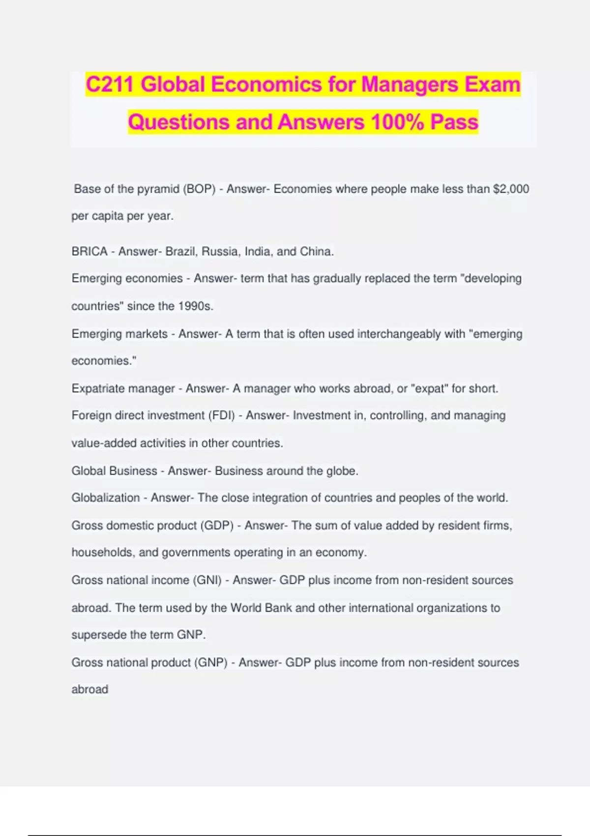C211 Global Economics for Managers Exam Questions and Answers 100% Pass Base of the pyramid (BOP) - Answer- Economies where people make less than $2,000 per capita per year. BRICA - Answer- Brazil, Russia, India, and China. Emerging economies - Answer- term that has gradually replaced the term "developing countries" since the 1990s. Emerging markets - Answer- A term that is often used interchangeably with "emerging economies." Expatriate manager - Answer- A manager who works abroad, or "expat" for short. Foreign direct investment (FDI) - Answer- Investment in, controlling, and managing value-added activities in other countries. Global Business - Answer- Business around the globe. Globalization - Answer- The close integration of countries and peoples of the world. Gross domestic product (GDP) - Answer- The sum of value added by resident firms, households, and governments operating in an economy. Gross national income (GNI) - Answer- GDP plus income from non-resident sources abroad. The term used by the World Bank and other international organizations to supersede the term GNP. Gross national product (GNP) - Answer- GDP plus income from non-resident sources abroad Group of 20 (G-20) - Answer- The group of 19 major countries plus the European Union (EU) whose leaders meet on a biannual basis to solve global economic problems. International business (IB) - Answer- (1) A business (or firm) that engages in international (cross-border) economic activities and/or (2) the action of doing business abroad. International premium - Answer- A significant pay raise when working overseas. Liability of foreignness - Answer- The inherent disadvantage that foreign firms experience in host countries because of their non-native status. Multinational enterprise (MNE) - Answer- A firm that engages in foreign direct investment (FDI). Nongovernmental organization (NGO) - Answer- An organization that is not affiliated with governments. Purchasing power parity (PPP) - Answer- A conversion that determines the equivalent amount of goods and services that different currencies can purchase. Reverse innovation - Answer- An innovation that is adopted first in emerging economies and is then diffused around the world