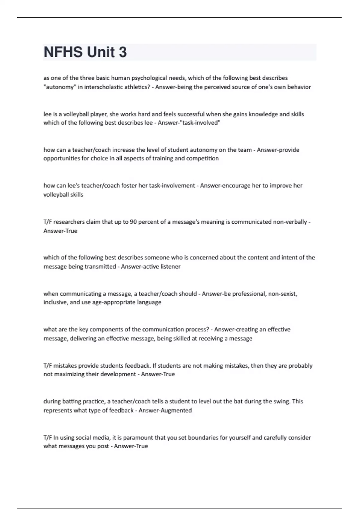 as one of the three basic human psychological needs, which of the following best describes "autonomy" in interscholastic athletics? - Answer-being the perceived source of one's own behavior lee is a volleyball player, she works hard and feels successful when she gains knowledge and skills which of the following best describes lee - Answer-"task-involved" how can a teacher/coach increase the level of student autonomy on the team - Answer-provide opportunities for choice in all aspects of training and competition how can lee's teacher/coach foster her task-involvement - Answer-encourage her to improve her volleyball skills T/F researchers claim that up to 90 percent of a message's meaning is communicated non-verbally - Answer-True which of the following best describes someone who is concerned about the content and intent of the message being transmitted - Answer-active listener when communicating a message, a teacher/coach should - Answer-be professional, non-sexist, inclusive, and use age-appropriate language what are the key components of the communication process? - Answer-creating an effective message, delivering an effective message, being skilled at receiving a message T/F mistakes provide students feedback. If students are not making mistakes, then they are probably not maximizing their development - Answer-True during batting practice, a teacher/coach tells a student to level out the bat during the swing. This represents what type of feedback - Answer-Augmented T/F In using social media, it is paramount that you set boundaries for yourself and carefully consider what messages you post - Answer-Truea teacher/coach gives the following feedback. "I have told you several times to not use profane language during games. As is Cleary noted in the athletic handbook, you must sit out for the rest of the game. " what statement best describes the use of this feedback statement - Answer-it is an appropriate use of feedback for punishment because it has the goal of suppressing unsparing or irresponsible T/F students who set exclusively outcome goals often experience decreases in their confidence when the fail to meet the goal and perceive this as a failure - Answer-True