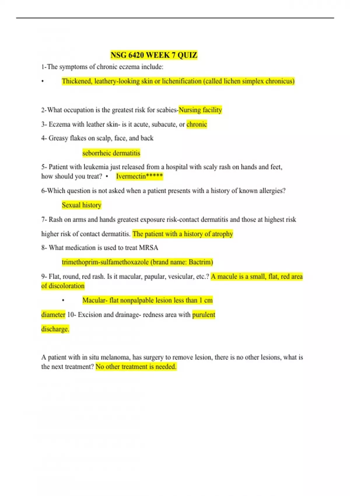 NSG 6420 WEEK 7 QUIZ 1- The symptoms of chronic eczema include: • Thickened, leathery-looking skin or lichenification (called lichen simplex chronicus) 2- What occupation is the greatest risk for scabies-Nursing facility 3- Eczema with leather skin- is it acute, subacute, or chronic 4- Greasy flakes on scalp, face, and back seborrheic dermatitis 5- Patient with leukemia just released from a hospital with scaly rash on hands and feet, how should you treat? • Ivermectin***** 6- Which question is not asked when a patient presents with a history of known allergies? Sexual history 7- Rash on arms and hands greatest exposure risk-contact dermatitis and those at highest risk higher risk of contact dermatitis. The patient with a history of atrophy 8- What medication is used to treat MRSA trimethoprim-sulfamethoxazole (brand name: Bactrim) 9- Flat, round, red rash. Is it macular, papular, vesicular, etc.? A macule is a small, flat, red area of discoloration • Macular- flat nonpalpable lesion less than 1 cm diameter 10- Excision and drainage- redness area with purulent discharge. A patient with in situ melanoma, has surgery to remove lesion, there is no other lesions, what is the next treatment? No other treatment is needed.