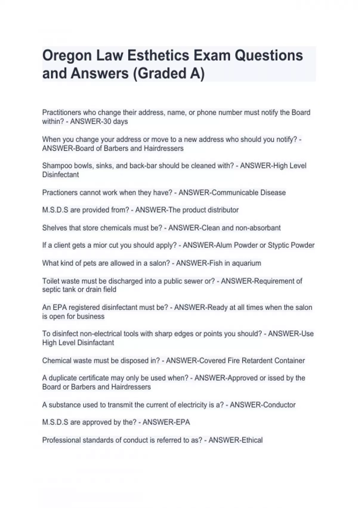 Oregon Law Esthetics Exam Questions and Answers (Graded A) Oregon Law Esthetics Exam Questions and Answers (Graded A) Oregon Law Esthetics Exam Questions and Answers (Graded A) Oregon Law Esthetics Exam Questions and Answers (Graded A) Practitioners who change their address, name, or phone number must notify the Board within? - ANSWER-30 days When you change your address or move to a new address who should you notify? - ANSWER-Board of Barbers and Hairdressers Shampoo bowls, sinks, and back-bar should be cleaned with? - ANSWER-High Level Disinfectant Practioners cannot work when they have? - ANSWER-Communicable Disease