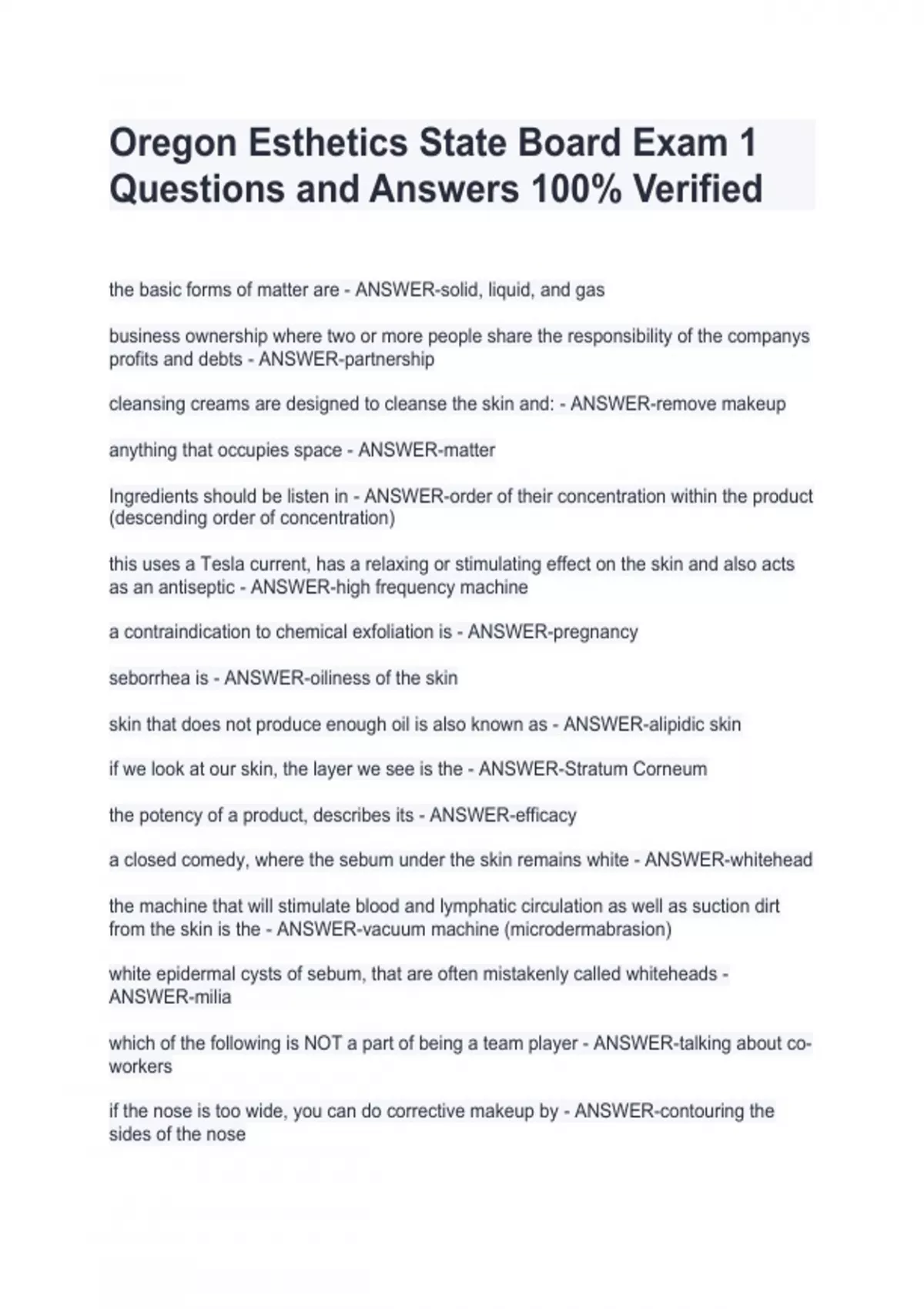 Oregon Esthetics State Board Exam 1 Questions and Answers 100% VerifiedOregon Esthetics State Board Exam 1 Questions and Answers 100% VerifiedOregon Esthetics State Board Exam 1 Questions and Answers 100% VerifiedOregon Esthetics State Board Exam 1 Questions and Answers 100% Verified the basic forms of matter are - ANSWER-solid, liquid, and gas business ownership where two or more people share the responsibility of the companys profits and debts - ANSWER-partnership cleansing creams are designed to cleanse the skin and: - ANSWER-remove makeup anything that occupies space - ANSWER-matter