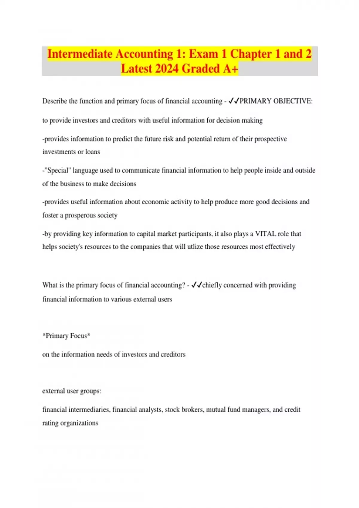 Intermediate Accounting 1: Exam 1 Chapter 1 and 2 Latest 2024 Graded A+ Describe the function and primary focus of financial accounting - PRIMARY OBJECTIVE: to provide investors and creditors with useful information for decision making -provides information to predict the future risk and potential return of their prospective investments or loans -"Special" language used to communicate financial information to help people inside and outside of the business to make decisions -provides useful information about economic activity to help produce more good decisions and foster a prosperous society -by providing key information to capital market participants, it also plays a VITAL role that helps society's resources to the companies that will utlize those resources most effectively What is the primary focus of financial accounting? - chiefly concerned with providing financial information to various external users *Primary Focus* on the information needs of investors and creditors
