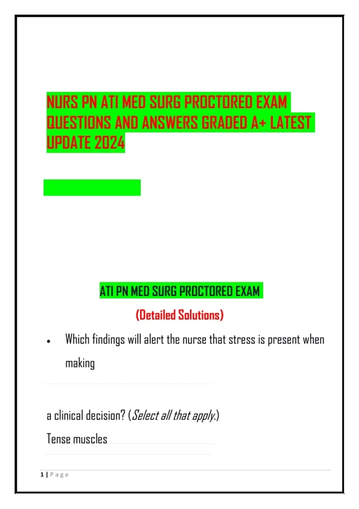 NURS PN ATI MED SURG PROCTORED EXAM QUESTIONS AND ANSWERS GRADED A+ LATEST UPDATE 2024 ATI PN MED SURG PROCTORED EXAM (Detailed Solutions) Which findings will alert the nurse that stress is present when making a clinical decision? (Select all that apply.) Tense muscles 2 | P a g e a. Reactive responses b. Trouble concentrating c. Very tired feelings d. Managed emotions ANS: A, B, C, D Learn to recognize when you are feeling stressed—your muscles will tense, you become reactive when others communicate with you, you have trouble concentrating, and you feel very tired. Emotions are not managed when stressed.