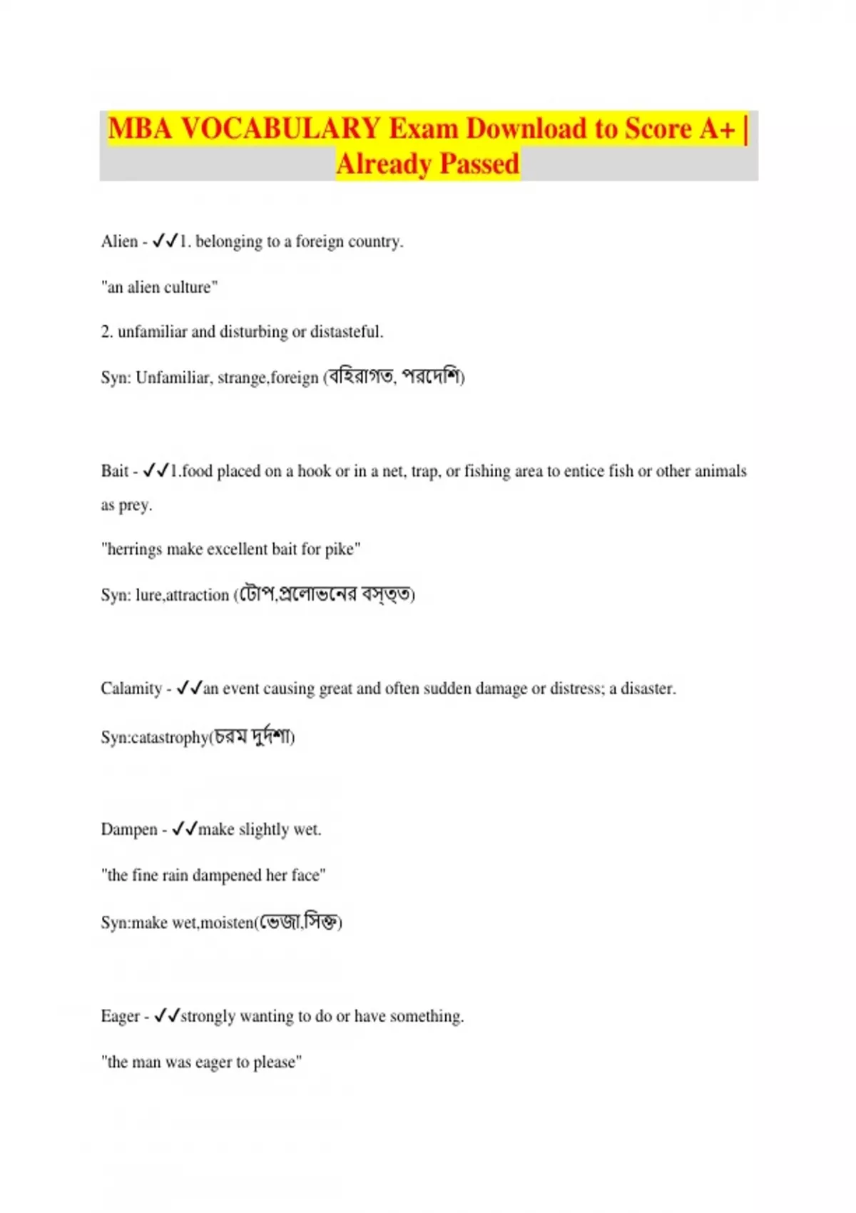 MBA VOCABULARY Exam Download to Score A+ | Already Passed Alien - 1. belonging to a foreign country. "an alien culture" 2. unfamiliar and disturbing or distasteful. Syn: Unfamiliar, strange,foreign (বহিরাগত, পরদেহি) Bait - placed on a hook or in a net, trap, or fishing area to entice fish or other animals as prey. "herrings make excellent bait for pike" Syn: lure,attraction (ট াপ,প্রদ াভদের বস্ত্ত) Calamity - an event causing great and often sudden damage or distress; a disaster. Syn:catastrophy(চরম েুেদিা) Dampen - make slightly wet. "the fine rain dampened her face" Syn:make wet,moisten(টভজা,হসক্ত)