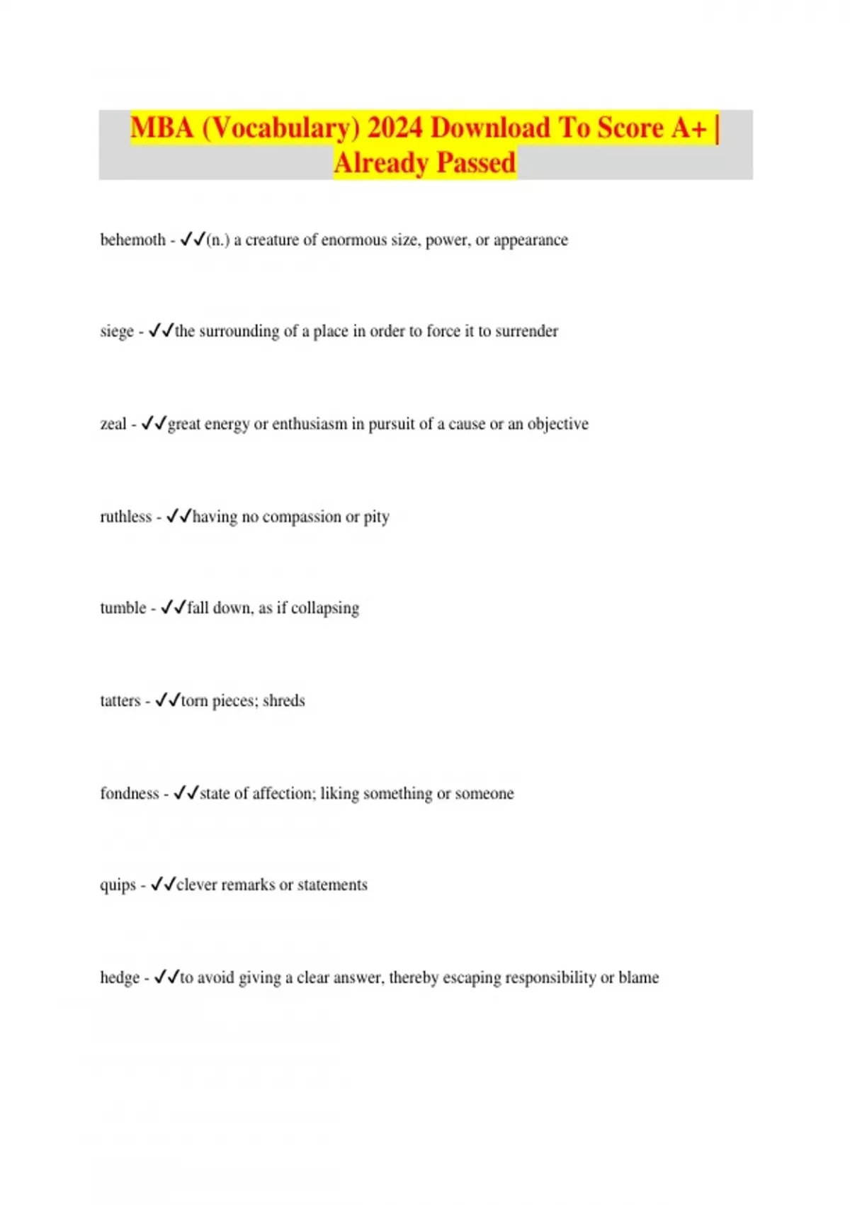 MBA (Vocabulary) 2024 Download To Score A+ | Already Passed behemoth - (n.) a creature of enormous size, power, or appearance siege - the surrounding of a place in order to force it to surrender zeal - great energy or enthusiasm in pursuit of a cause or an objective ruthless - having no compassion or pity tumble - fall down, as if collapsing tatters - torn pieces; shreds