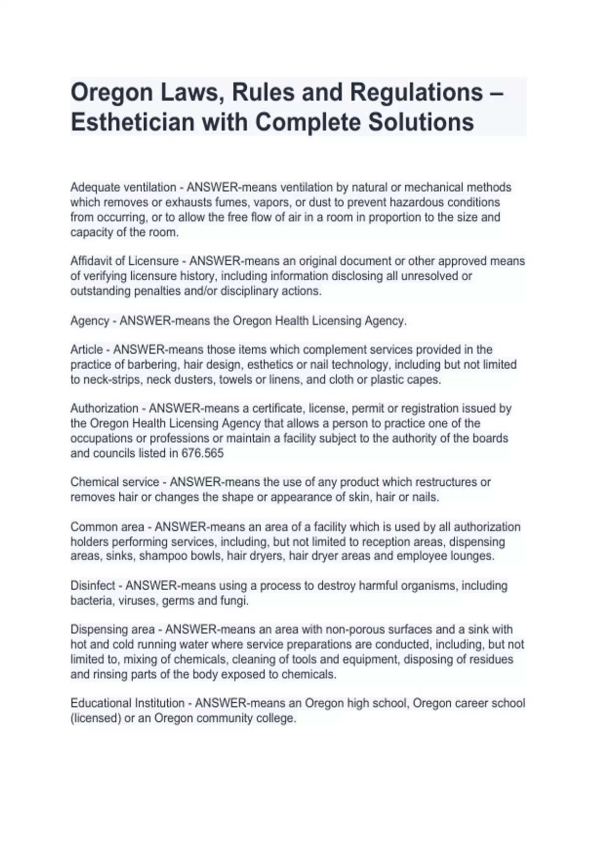 Oregon Laws, Rules and Regulations – Esthetician with Complete SolutionsOregon Laws, Rules and Regulations – Esthetician with Complete SolutionsOregon Laws, Rules and Regulations – Esthetician with Complete Solutions Adequate ventilation - ANSWER-means ventilation by natural or mechanical methods which removes or exhausts fumes, vapors, or dust to prevent hazardous conditions from occurring, or to allow the free flow of air in a room in proportion to the size and capacity of the room. Affidavit of Licensure - ANSWER-means an original document or other approved means of verifying licensure history, including information disclosing all unresolved or outstanding penalties and/or disciplinary actions. Agency - ANSWER-means the Oregon Health Licensing Agency. Article - ANSWER-means those items which complement services provided in the practice of barbering, hair design, esthetics or nail technology, including but not limited to neck-strips, neck dusters, towels or linens, and cloth or plastic capes. Authorization - ANSWER-means a certificate, license, permit or registration issued by the Oregon Health Licensing Agency that allows a person to practice one of the