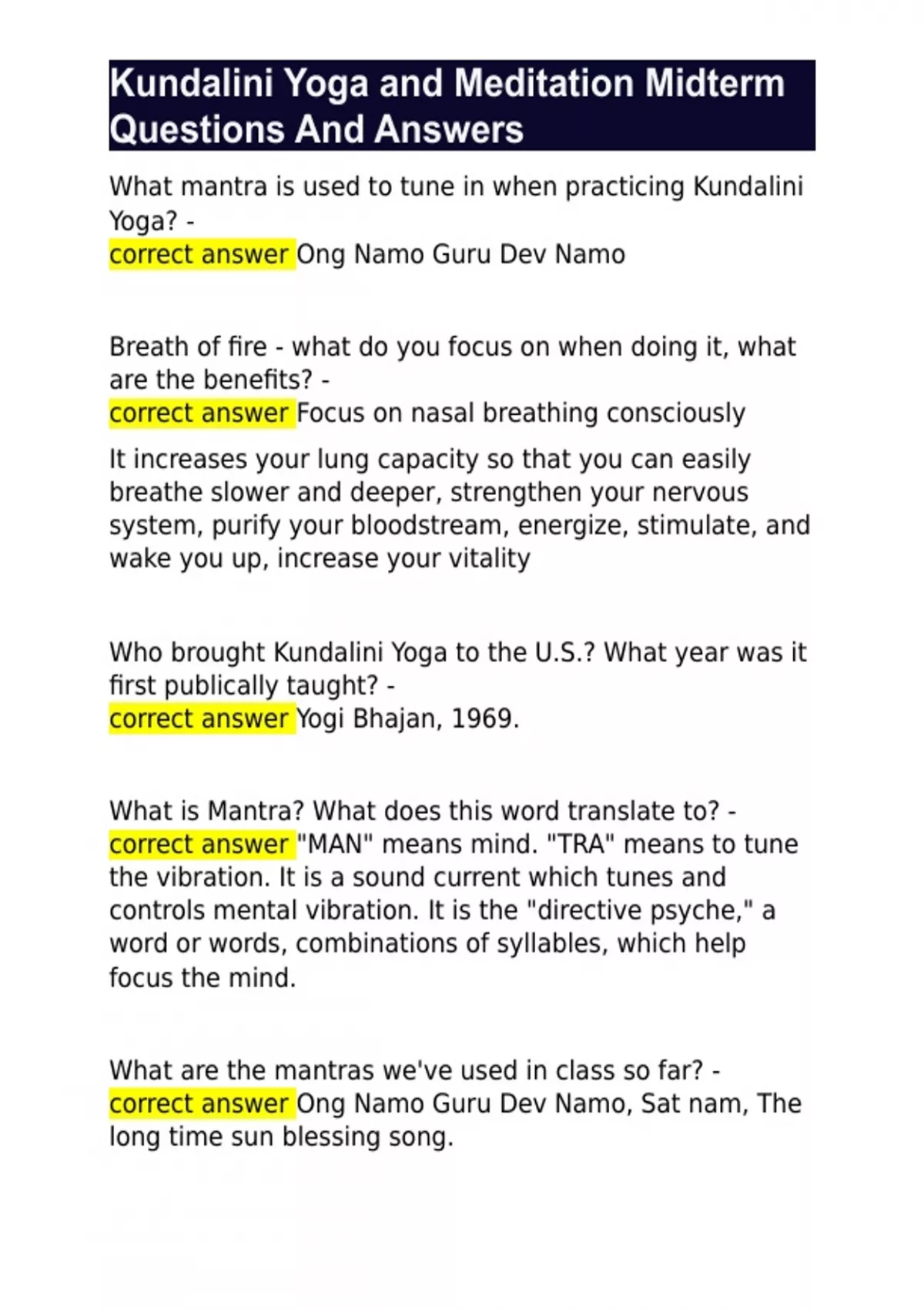Kundalini Yoga and Meditation Midterm Questions And Answers