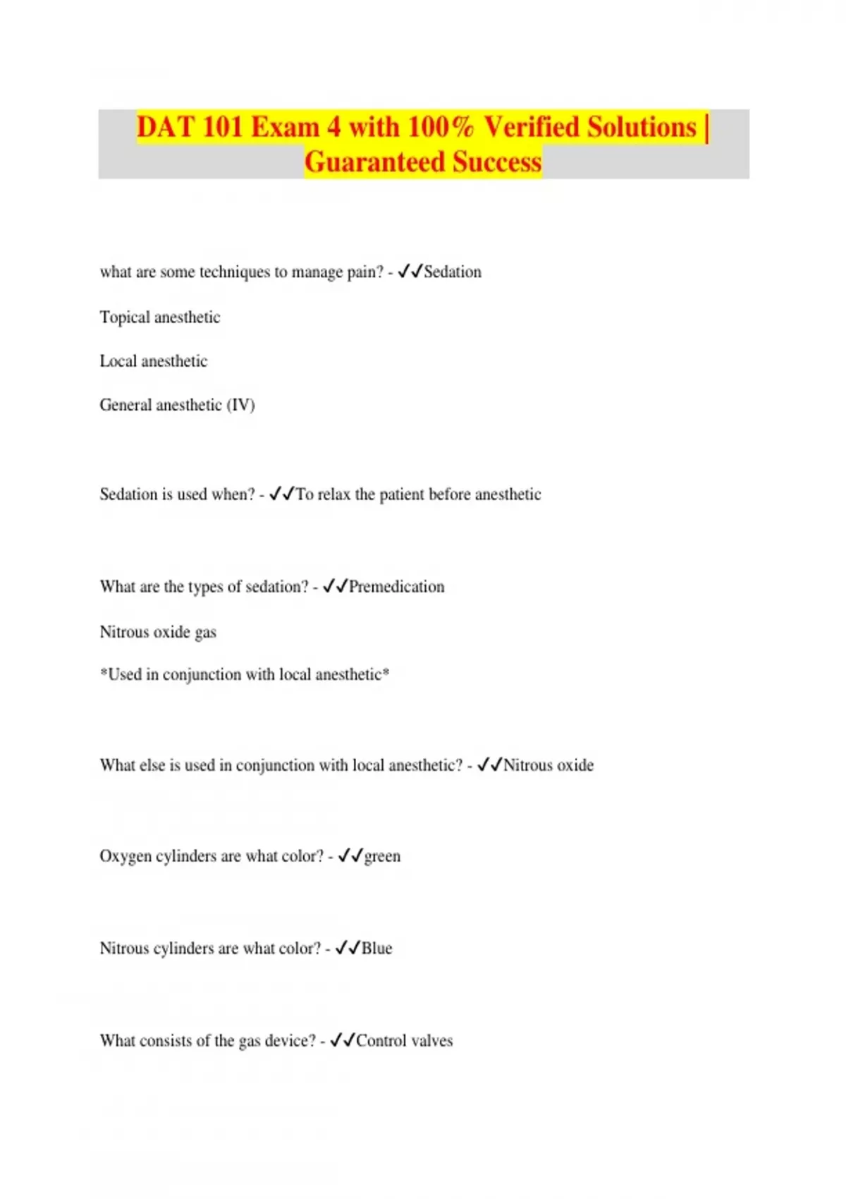 DAT 101 Exam 4 with 100% Verified Solutions | Guaranteed Success what are some techniques to manage pain? - Sedation Topical anesthetic Local anesthetic General anesthetic (IV) Sedation is used when? - To relax the patient before anesthetic What are the types of sedation? - Premedication Nitrous oxide gas *Used in conjunction with local anesthetic* What else is used in conjunction with local anesthetic? - Nitrous oxide Oxygen cylinders are what color? - green Nitrous cylinders are what color? - Blue What consists of the gas device? - Control valves