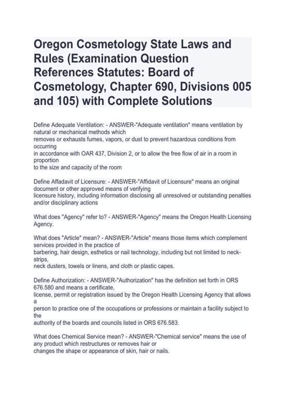 Oregon Cosmetology State Laws and Rules (Examination Question References Statutes: Board of Cosmetology, Chapter 690, Divisions 005 and 105) with Complete SolutionsOregon Cosmetology State Laws and Rules (Examination Question References Statutes: Board of Cosmetology, Chapter 690, Divisions 005 and 105) with Complete SolutionsOregon Cosmetology State Laws and Rules (Examination Question References Statutes: Board of Cosmetology, Chapter 690, Divisions 005 and 105) with Complete Solutions Define Adequate Ventilation: - ANSWER-"Adequate ventilation" means ventilation by natural or mechanical methods which removes or exhausts fumes, vapors, or dust to prevent hazardous conditions from occurring in accordance with OAR 437, Division 2, or to allow the free flow of air in a room in proportion to the size and capacity of the room Define Affadavit of Licensure: - ANSWER-"Affidavit of Licensure" means an original document or other approved means of verifying licensure history, including information disclosing all unresolved or outstanding penalties and/or disciplinary actions What does "Agency" refer to? - ANSWER-"Agency" means the Oregon Health Licensing Agency.