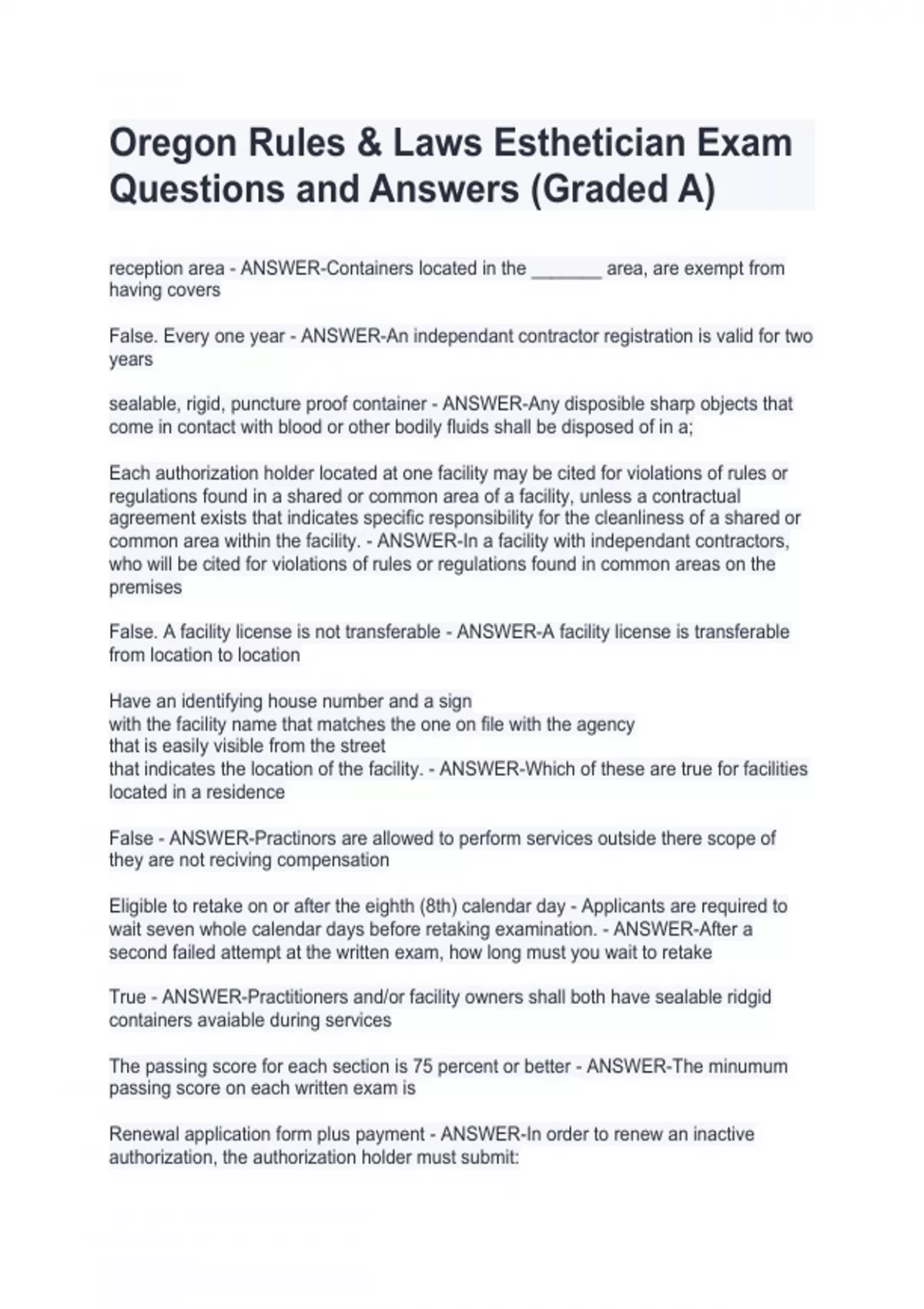 Oregon Rules & Laws Esthetician Exam Questions and Answers (Graded A)Oregon Rules & Laws Esthetician Exam Questions and Answers (Graded A)Oregon Rules & Laws Esthetician Exam Questions and Answers (Graded A) reception area - ANSWER-Containers located in the _______ area, are exempt from having covers False. Every one year - ANSWER-An independant contractor registration is valid for two years sealable, rigid, puncture proof container - ANSWER-Any disposible sharp objects that come in contact with blood or other bodily fluids shall be disposed of in a; Each authorization holder located at one facility may be cited for violations of rules or regulations found in a shared or common area of a facility, unless a contractual