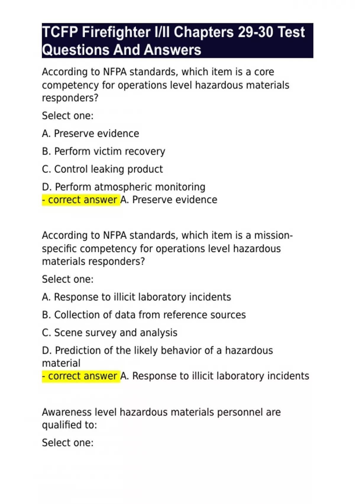 TCFP Firefighter I/II Chapters 29-30 Test Questions And Answers