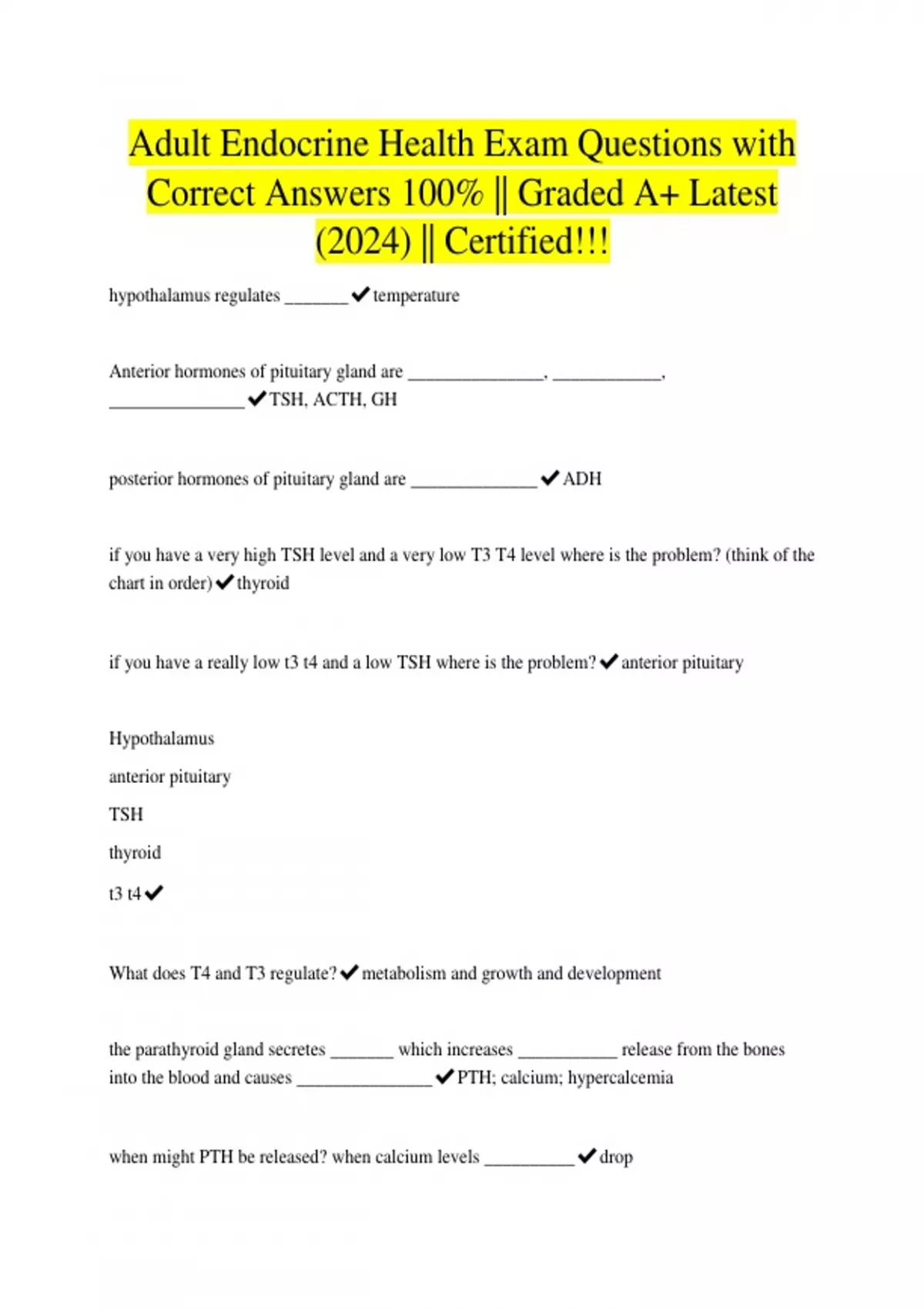 Adult Endocrine Health Exam Questions with Correct Answers 100% || Graded A+ Latest (2024) || Certified!!!