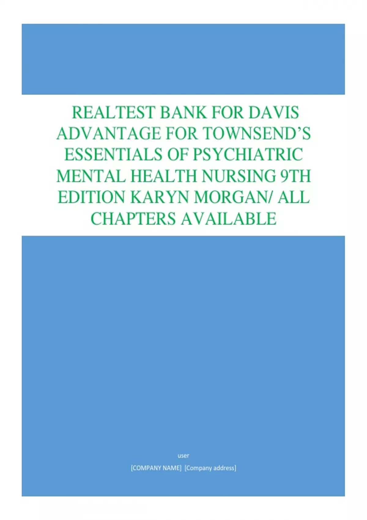 TEST BANK FOR DAVIS ADVANTAGE FOR TOWNSEND’S ESSENTIALS OF PSYCHIATRIC MENTAL HEALTH NURSING 9TH EDITION KARYN MORGAN/ ALL CHAPTERS AVAILABLE