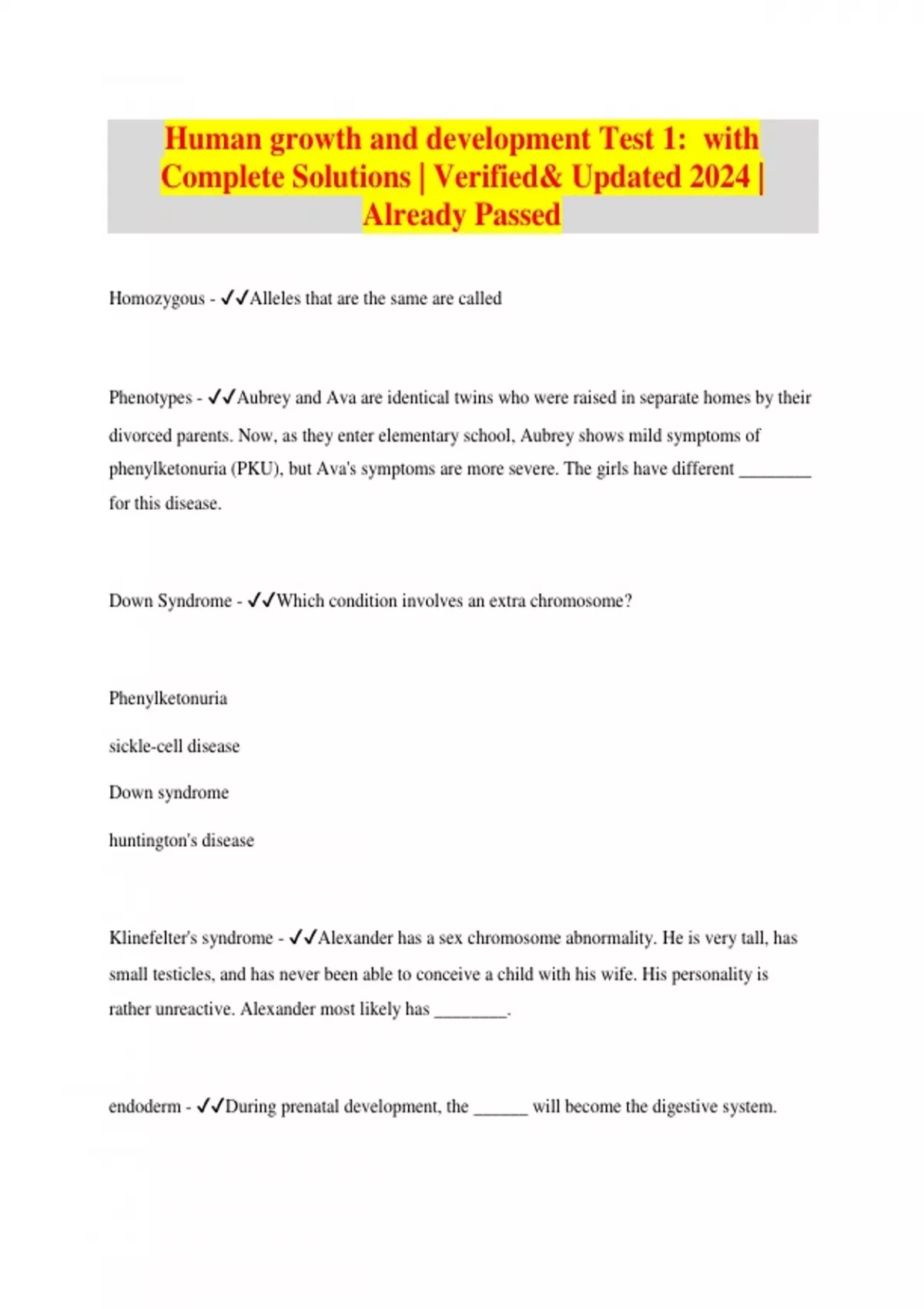 Human growth and development Test 1: with Complete Solutions | Verified& Updated 2024 | Already Passed Homozygous - Alleles that are the same are called Phenotypes - Aubrey and Ava are identical twins who were raised in separate homes by their divorced parents. Now, as they enter elementary school, Aubrey shows mild symptoms of phenylketonuria (PKU), but Ava's symptoms are more severe. The girls have different ________ for this disease. Down Syndrome - Which condition involves an extra chromosome? Phenylketonuria sickle-cell disease Down syndrome huntington's disease Klinefelter's syndrome - Alexander has a sex chromosome abnormality. He is very tall, has small testicles, and has never been able to conceive a child with his wife. His personality is rather unreactive. Alexander most likely has ________
