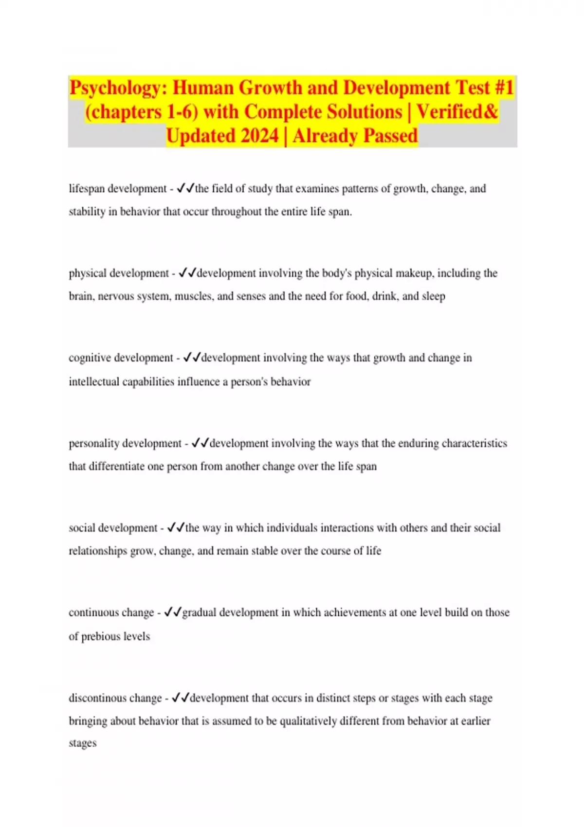 Psychology: Human Growth and Development Test #1 (chapters 1-6) with Complete Solutions | Verified& Updated 2024 | Already Passed lifespan development - the field of study that examines patterns of growth, change, and stability in behavior that occur throughout the entire life span. physical development - development involving the body's physical makeup, including the brain, nervous system, muscles, and senses and the need for food, drink, and sleep cognitive development - development involving the ways that growth and change in intellectual capabilities influence a person's behavior personality development - development involving the ways that the enduring characteristics that differentiate one person from another change over the life span social development - the way in which individuals interactions with others and their social relationships grow, change, and remain stable over the course of life continuous change - gradual development in which achievements at one level build on those of prebious levels
