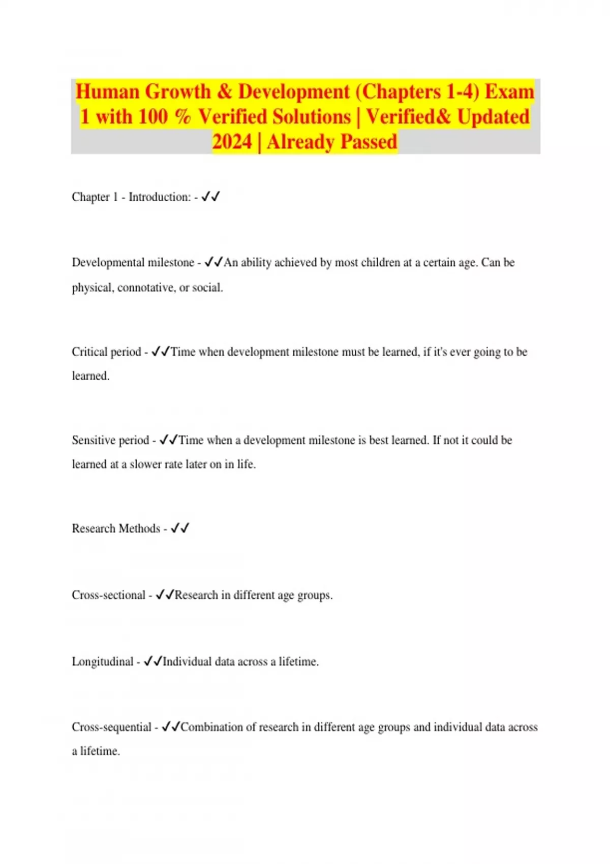 Human Growth & Development (Chapters 1-4) Exam 1 with 100 % Verified Solutions | Verified& Updated 2024 | Already Passed Chapter 1 - Introduction: - Developmental milestone - An ability achieved by most children at a certain age. Can be physical, connotative, or social. Critical period - Time when development milestone must be learned, if it's ever going to be learned. Sensitive period - Time when a development milestone is best learned. If not it could be learned at a slower rate later on in life. Research Methods - Cross-sectional - Research in different age groups. Longitudinal - Individual data across a lifetime
