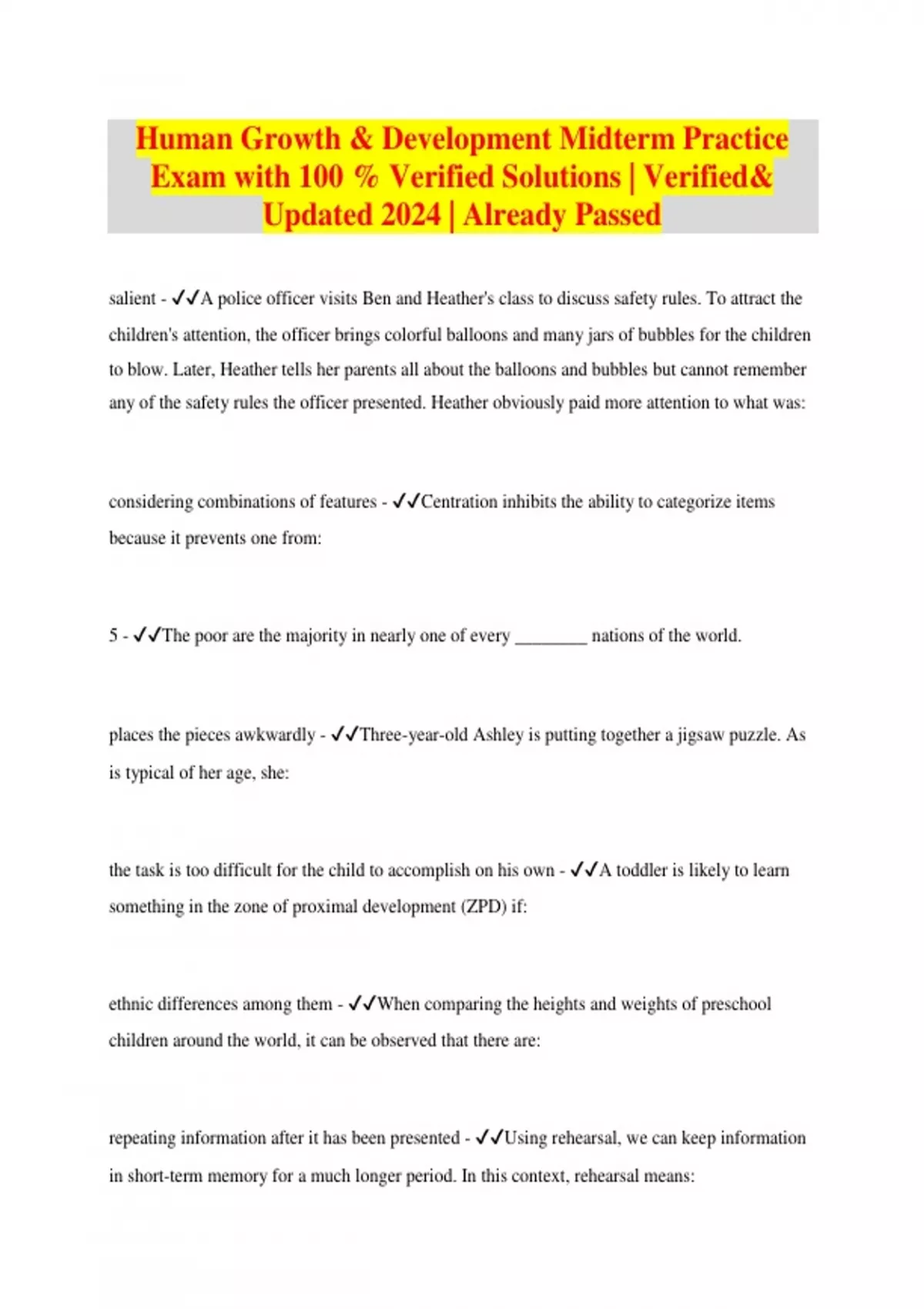 Human Growth & Development Midterm Practice Exam with 100 % Verified Solutions | Verified& Updated 2024 | Already Passed salient - A police officer visits Ben and Heather's class to discuss safety rules. To attract the children's attention, the officer brings colorful balloons and many jars of bubbles for the children to blow. Later, Heather tells her parents all about the balloons and bubbles but cannot remember any of the safety rules the officer presented. Heather obviously paid more attention to what was: considering combinations of features - Centration inhibits the ability to categorize items because it prevents one from: 5 - The poor are the majority in nearly one of every ________ nations of the world. places the pieces awkwardly - Three-year-old Ashley is putting together a jigsaw puzzle. As is typical of her age, she: the task is too difficult for the child to accomplish on his own - A toddler is likely to learn something in the zone of proximal development (ZPD) if: ethnic differences among them - When comparing the heights and weights of preschool children around the world, it can be observed that there are: repeating information after it has been presented - Using rehearsal, we can keep information in short-term memory for a much longer period. In this context, rehearsal means