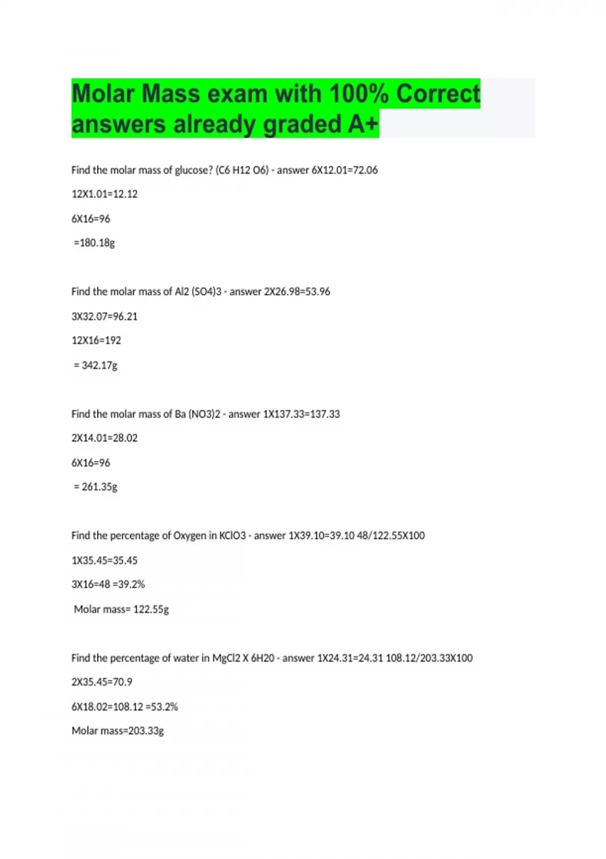 Molar Mass exam with 100% Correct answers already graded A+