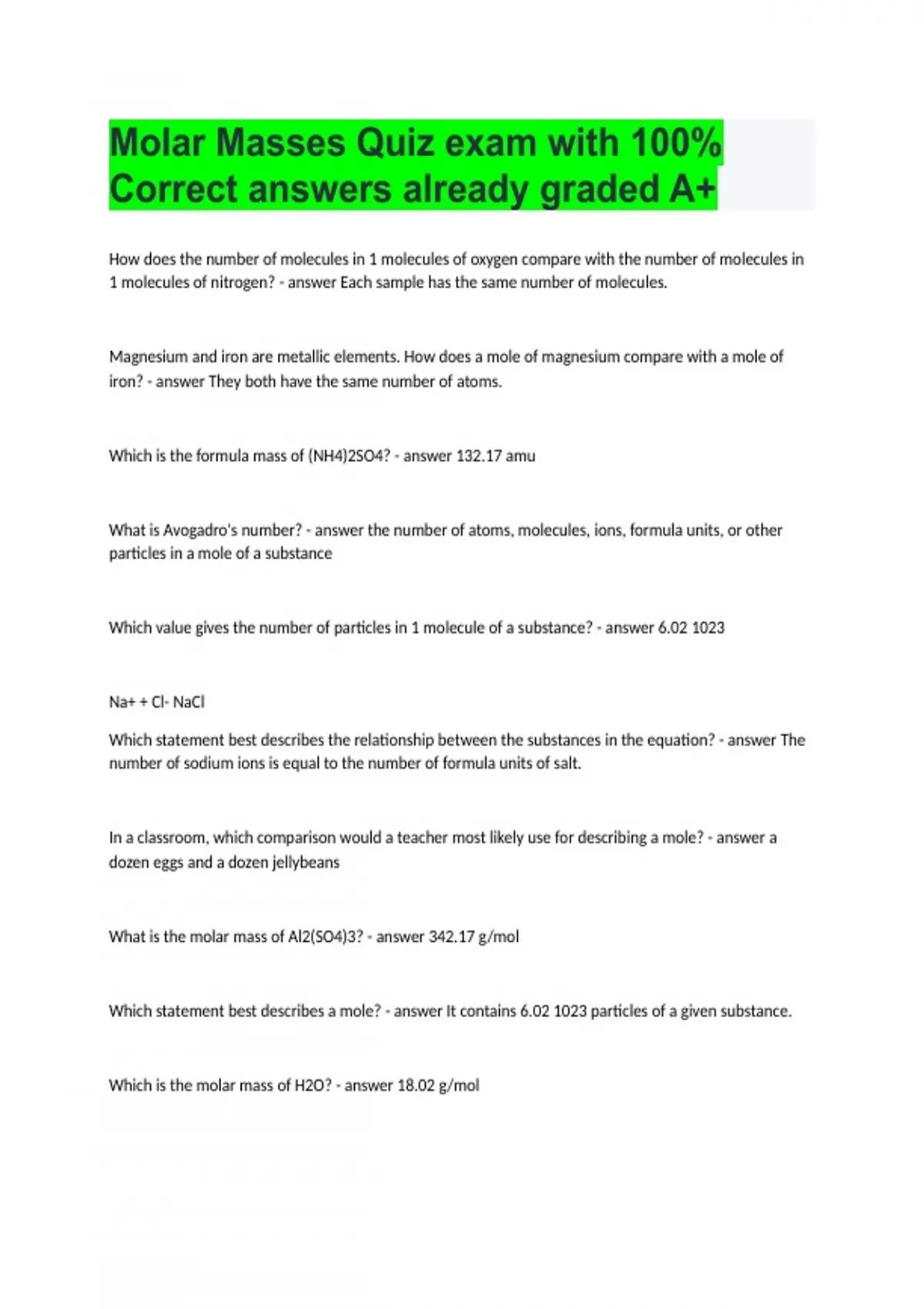 Molar Masses Quiz exam with 100% Correct answers already graded A+