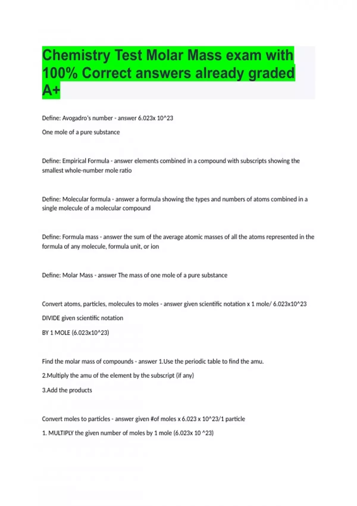 Chemistry Test Molar Mass exam with 100% Correct answers already graded A+