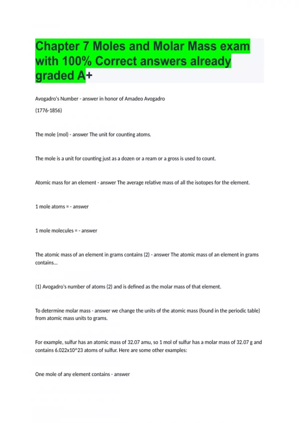Chapter 7 Moles and Molar Mass exam with 100% Correct answers already graded A+