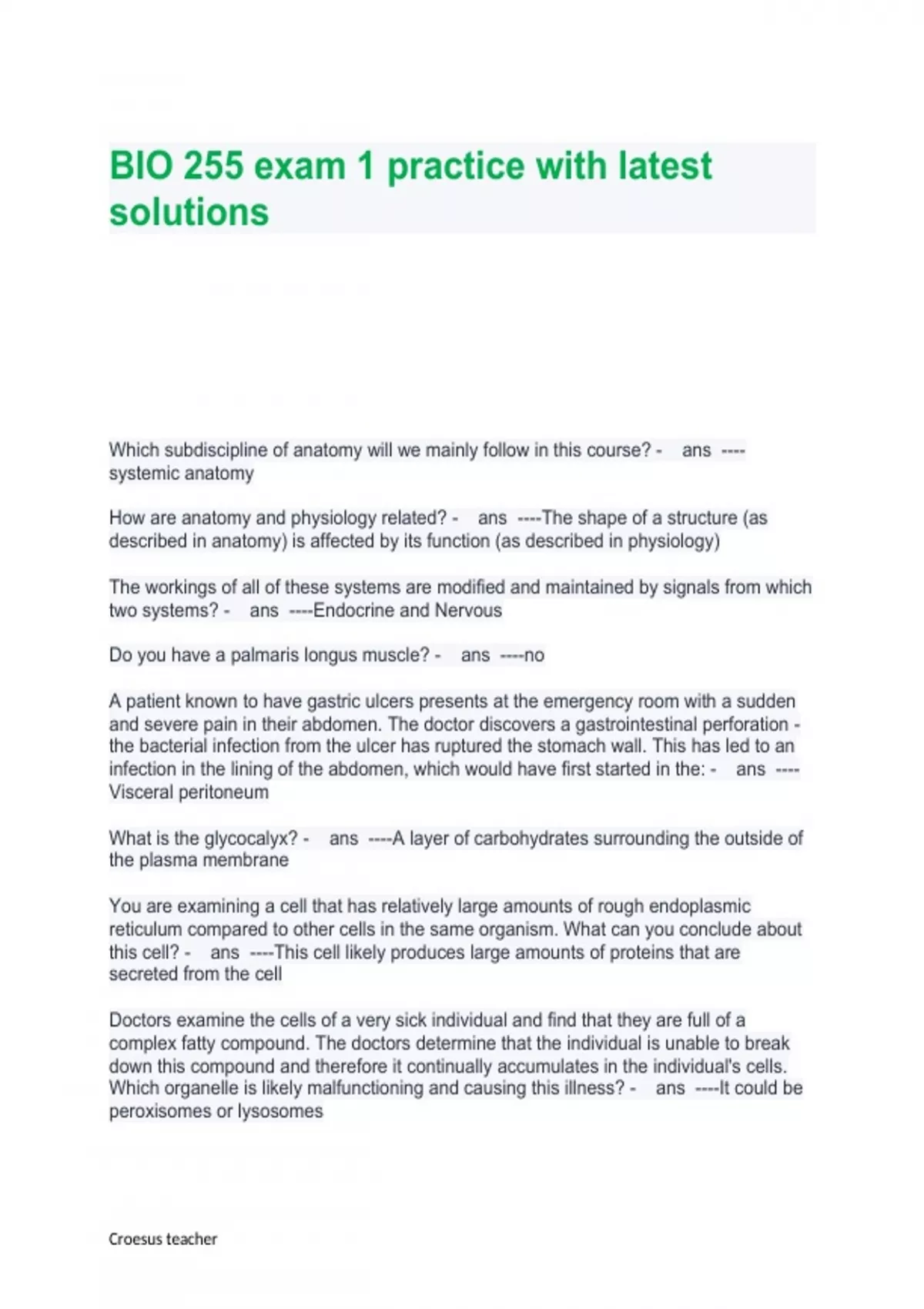 Which subdiscipline of anatomy will we mainly follow in this course? - ans ----systemic anatomy How are anatomy and physiology related? - ans ----The shape of a structure (as described in anatomy) is affected by its function (as described in physiology) The workings of all of these systems are modified and maintained by signals from which two systems? - ans ----Endocrine and Nervous Do you have a palmaris longus muscle? - ans ----no A patient known to have gastric ulcers presents at the emergency room with a sudden and severe pain in their abdomen. The doctor discovers a gastrointestinal perforation - the bacterial infection from the ulcer has ruptured the stomach wall. This has led to an infection in the lining of the abdomen, which would have first started in the: - ans ----Visceral peritoneum What is the glycocalyx? - ans ----A layer of carbohydrates surrounding the outside of the plasma membrane You are examining a cell that has relatively large amounts of rough endoplasmic reticulum compared to other cells in the same organism. What can you conclude about this cell? - ans ----This cell likely produces large amounts of proteins that are secreted from the cell Doctors examine the cells of a very sick individual and find that they are full of a complex fatty compound. The doctors determine that the individual is unable to break down this compound and therefore it continually accumulates in the individual's cells. Which organelle is likely malfunctioning and causing this illness? - ans ----It could be peroxisomes or lysosomes