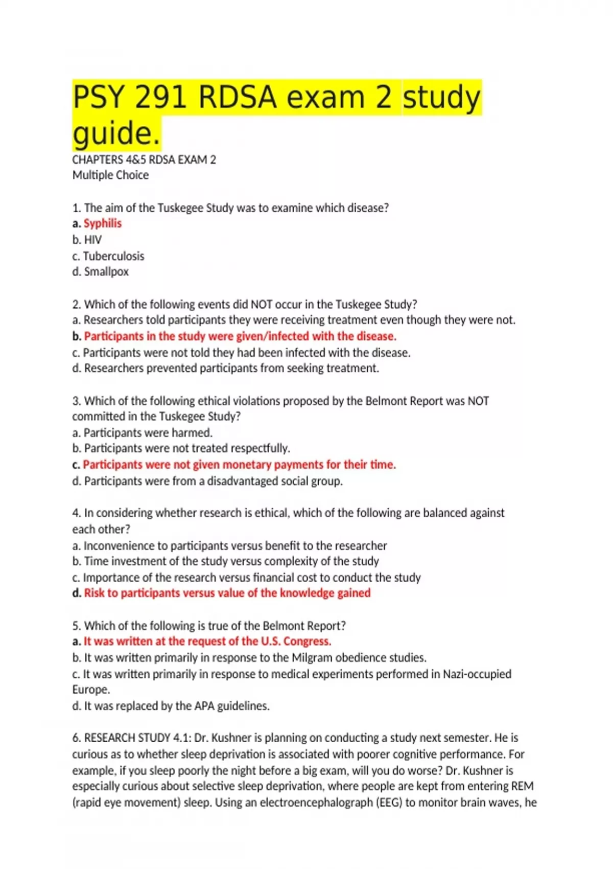 PSY 291 RDSA exam 2 study guide. CHAPTERS 4&5 RDSA EXAM 2 Multiple Choice 1. The aim of the Tuskegee Study was to examine which disease? a. Syphilis b. HIV c. Tuberculosis d. Smallpox 2. Which of the following events did NOT occur in the Tuskegee Study? a. Researchers told participants they were receiving treatment even though they were not. b. Participants in the study were given/infected with the disease. c. Participants were not told they had been infected with the disease. d. Researchers prevented participants from seeking treatment. 3. Which of the following ethical violations proposed by the Belmont Report was NOT committed in the Tuskegee Study? a. Participants were harmed. b. Participants were not treated respectfully. c. Participants were not given monetary payments for their time. d. Participants were from a disadvantaged social group. 4. In considering whether research is ethical, which of the following are balanced against each other? a. Inconvenience to participants versus benefit to the researcher b. Time investment of the study versus complexity of the study c. Importance of the research versus financial cost to conduct the study d. Risk to participants versus value of the knowledge gained 5. Which of the following is true of the Belmont Report? a. It was written at the request of the U.S. Congress. b. It was written primarily in response to the Milgram obedience studies. c. It was written primarily in response to medical experiments performed in Nazi-occupied Europe. d. It was replaced by the APA guidelines. 6. RESEARCH STUDY 4.1: Dr. Kushner is planning on conducting a study next semester. He is curious as to whether sleep deprivation is associated with poorer cognitive performance. For example, if you sleep poorly the night before a big exam, will you do worse? Dr. Kushner is especially curious about selective sleep deprivation, where people are kept from entering REM (rapid eye movement) sleep. Using an electroencephalograph (EEG) to monitor brain waves, he plans to let participants sleep until they enter REM sleep and then wake them. After the participants are awake for one minute, Dr. Kushner plans to let them return to sleep. As they enter REM sleep again, he will wake them again and follow the same procedure. He plans to do this through the entire eight-hour sleep session. The following morning, participants will be asked to take a sample SAT test. Dr. Kushner asks his participants to provide informed consent. Doing this is adhering to which principle of the Belmont Report? a. The principle of beneficence b. The principle of justice c. The principle of integrity d. The principle of respect for persons 7. RESEARCH STUDY 4.1: Dr. Kushner is planning on conducting a study next semester. He is curious as to whether sleep deprivation is associated with poorer cognitive performance. For example, if you sleep poorly the night before a big exam, will you do worse? Dr. Kushner is especially curious about selective sleep deprivation, where people are kept from entering REM (rapid eye movement) sleep. Using an electroencephalograph (EEG) to monitor brain waves, he plans to let participants sleep until they enter REM sleep and then wake them. After the participants are awake for one minute, Dr. Kushner plans to let them return to sleep. As they enter REM sleep again, he will wake them again and follow the same procedure. He plans to do this through the entire eight-hour sleep session. The following morning, participants will be asked to take a sample SAT test. Imagine that Dr. Kushner is a clinical psychologist who volunteers his time at a local prison counseling several inmates. Because of his connections there, he is considering using prisoners as his participants. Why is this choice potentially problematic? a. According to the Belmont Report, prisoners are entitled to special protection. b. Prisoners do not make good participants since they may not tell the truth. c. Prisoners are unable to give informed consent. d. More prisoners may want to participate than Dr. Kushner can actually study. 8. RESEARCH STUDY 4.1: Dr. Kushner is planning on conducting a study next semester. He is curious as to whether sleep deprivation is associated with poorer cognitive performance. For example, if you sleep poorly the night before a big exam, will you do worse? Dr. Kushner is especially curious about selective sleep deprivation, where people are kept from entering REM (rapid eye movement) sleep. Using an electroencephalograph (EEG) to monitor brain waves, he plans to let participants sleep until they enter REM sleep and then wake them. After the participants are awake for one minute, Dr. Kushner plans to let them return to sleep. As they enter REM sleep again, he will wake them again and follow the same procedure. He plans to do this through the entire eight-hour sleep session. The following morning, participants will be asked to take a sample SAT test. To address the Belmont principle of beneficence, Dr. Kushner would need to ask which of the following questions? a. Are the people in my study going to benefit as much as the people who are not in my study? b. What can I do to decrease the potential harm experienced by my participants? c. Can the participants in my study give full, informed consent? d. Am I trained sufficiently to conduct this study? 9. RESEARCH STUDY 4.1: Dr. Kushner is planning on conducting a study next semester. He is curious as to whether sleep deprivation is associated with poorer cognitive performance. For example, if you sleep poorly the night before a big exam, will you do worse? Dr. Kushner is especially curious about selective sleep deprivation, where people are kept from entering REM (rapid eye movement) sleep. Using an electroencephalograph (EEG) to monitor brain waves, he plans to let participants sleep until they enter REM sleep and then wake them. After the participants are awake for one minute, Dr. Kushner plans to let them return to sleep. As they enter RE