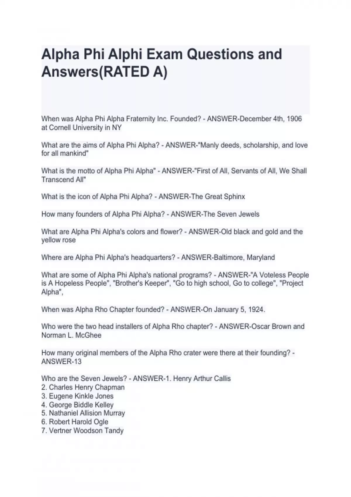 What are the aims of Alpha Phi Alpha? - ANSWER-"Manly deeds, scholarship, and love for all mankind" What is the motto of Alpha Phi Alpha" - ANSWER-"First of All, Servants of All, We Shall Transcend All" What is the icon of Alpha Phi Alpha? - ANSWER-The Great Sphinx How many founders of Alpha Phi Alpha? - ANSWER-The Seven Jewels What are Alpha Phi Alpha's colors and flower? - ANSWER-Old black and gold and the yellow rose Where are Alpha Phi Alpha's headquarters? - ANSWER-Baltimore, Maryland What are some of Alpha Phi Alpha's national programs? - ANSWER-"A Voteless People is A Hopeless People", "Brother's Keeper", "Go to high school, Go to college", "Project Alpha", When was Alpha Rho Chapter founded? - ANSWER-On January 5, 1924. Who were the two head installers of Alpha Rho chapter? - ANSWER-Oscar Brown and Norman L. McGhee How many original members of the Alpha Rho crater were there at their founding? - ANSWER-13 Who are the Seven Jewels? - ANSWER-1. Henry Arthur Callis 2. Charles Henry Chapman 3. Eugene Kinkle Jones 4. George Biddle Kelley 5. Nathaniel Allision Murray 6. Robert Harold Ogle 7. Vertner Woodson Tandy