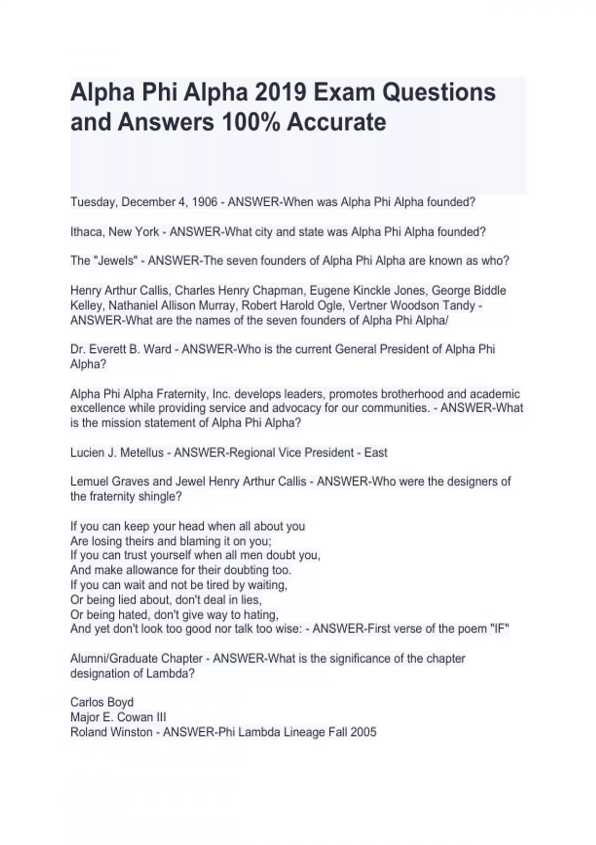 The "Jewels" - ANSWER-The seven founders of Alpha Phi Alpha are known as who? Henry Arthur Callis, Charles Henry Chapman, Eugene Kinckle Jones, George Biddle Kelley, Nathaniel Allison Murray, Robert Harold Ogle, Vertner Woodson Tandy - ANSWER-What are the names of the seven founders of Alpha Phi Alpha/ Dr. Everett B. Ward - ANSWER-Who is the current General President of Alpha Phi Alpha? Alpha Phi Alpha Fraternity, Inc. develops leaders, promotes brotherhood and academic excellence while providing service and advocacy for our communities. - ANSWER-What is the mission statement of Alpha Phi Alpha? Lucien J. Metellus - ANSWER-Regional Vice President - East Lemuel Graves and Jewel Henry Arthur Callis - ANSWER-Who were the designers of the fraternity shingle? If you can keep your head when all about you Are losing theirs and blaming it on you; If you can trust yourself when all men doubt you, And make allowance for their doubting too. If you can wait and not be tired by waiting, Or being lied about, don't deal in lies, Or being hated, don't give way to hating, And yet don't look too good nor talk too wise: - ANSWER-First verse of the poem "IF" Alumni/Graduate Chapter - ANSWER-What is the significance of the chapter designation of Lambda? Carlos Boyd Major E. Cowan III Roland Winston - ANSWER-Phi Lambda Lineage Fall 2005