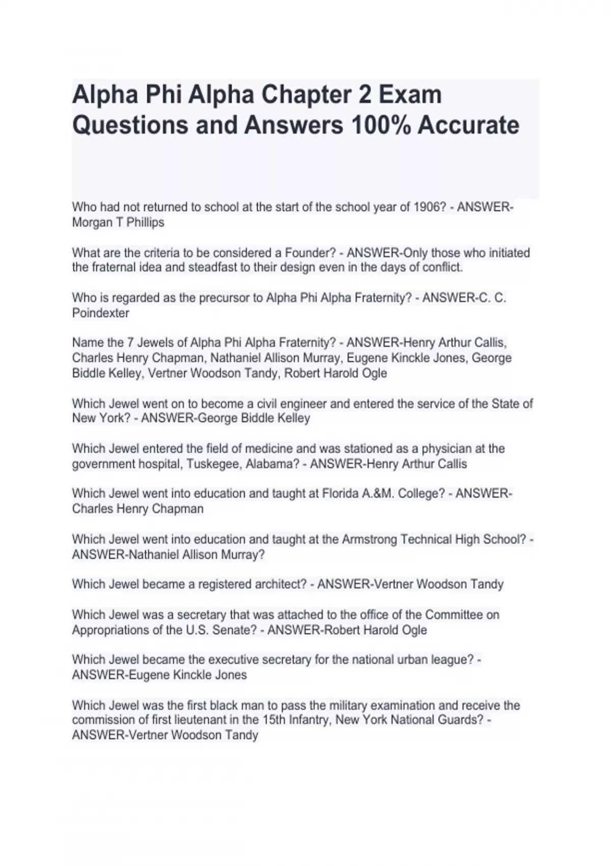 What are the criteria to be considered a Founder? - ANSWER-Only those who initiated the fraternal idea and steadfast to their design even in the days of conflict. Who is regarded as the precursor to Alpha Phi Alpha Fraternity? - ANSWER-C. C. Poindexter Name the 7 Jewels of Alpha Phi Alpha Fraternity? - ANSWER-Henry Arthur Callis, Charles Henry Chapman, Nathaniel Allison Murray, Eugene Kinckle Jones, George Biddle Kelley, Vertner Woodson Tandy, Robert Harold Ogle Which Jewel went on to become a civil engineer and entered the service of the State of New York? - ANSWER-George Biddle Kelley Which Jewel entered the field of medicine and was stationed as a physician at the government hospital, Tuskegee, Alabama? - ANSWER-Henry Arthur Callis Which Jewel went into education and taught at Florida A.&M. College? - ANSWER-Charles Henry Chapman Which Jewel went into education and taught at the Armstrong Technical High School? - ANSWER-Nathaniel Allison Murray? Which Jewel became a registered architect? - ANSWER-Vertner Woodson Tandy Which Jewel was a secretary that was attached to the office of the Committee on Appropriations of the U.S. Senate? - ANSWER-Robert Harold Ogle Which Jewel became the executive secretary for the national urban league? - ANSWER-Eugene Kinckle Jones Which Jewel was the first black man to pass the military examination and receive the commission of first lieutenant in the 15th Infantry, New York National Guards? - ANSWER-Vertner Woodson Tandy