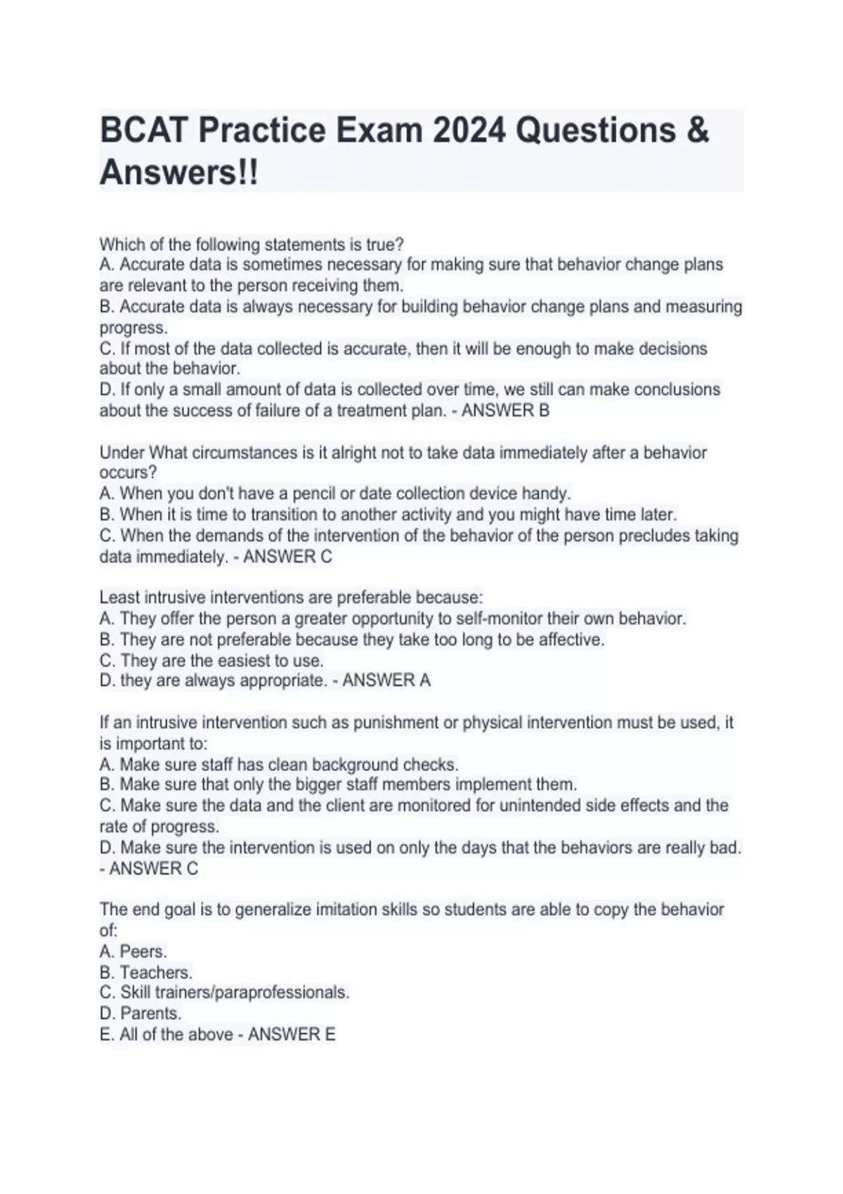 Which of the following statements is true? A. Accurate data is sometimes necessary for making sure that behavior change plans are relevant to the person receiving them. B. Accurate data is always necessary for building behavior change plans and measuring progress. C. If most of the data collected is accurate, then it will be enough to make decisions about the behavior. D. If only a small amount of data is collected over time, we still can make conclusions about the success of failure of a treatment plan. - ANSWER B Under What circumstances is it alright not to take data immediately after a behavior occurs? A. When you don't have a pencil or date collection device handy. B. When it is time to transition to another activity and you might have time later. C. When the demands of the intervention of the behavior of the person precludes taking data immediately. - ANSWER C Least intrusive interventions are preferable because: A. They offer the person a greater opportunity to self-monitor their own behavior. B. They are not preferable because they take too long to be affective. C. They are the easiest to use. D. they are always appropriate. - ANSWER A If an intrusive intervention such as punishment or physical intervention must be used, it is important to: A. Make sure staff has clean background checks. B. Make sure that only the bigger staff members implement them. C. Make sure the data and the client are monitored for unintended side effects and the rate of progress. D. Make sure the intervention is used on only the days that the behaviors are really bad. - ANSWER C The end goal is to generalize imitation skills so students are able to copy the behavior of: A. Peers. B. Teachers. C. Skill trainers/paraprofessionals. D. Parents. E. All of the above - ANSWER E Another end goal of imitation training is for the learner to continue to imitate behaviors in the absence of: