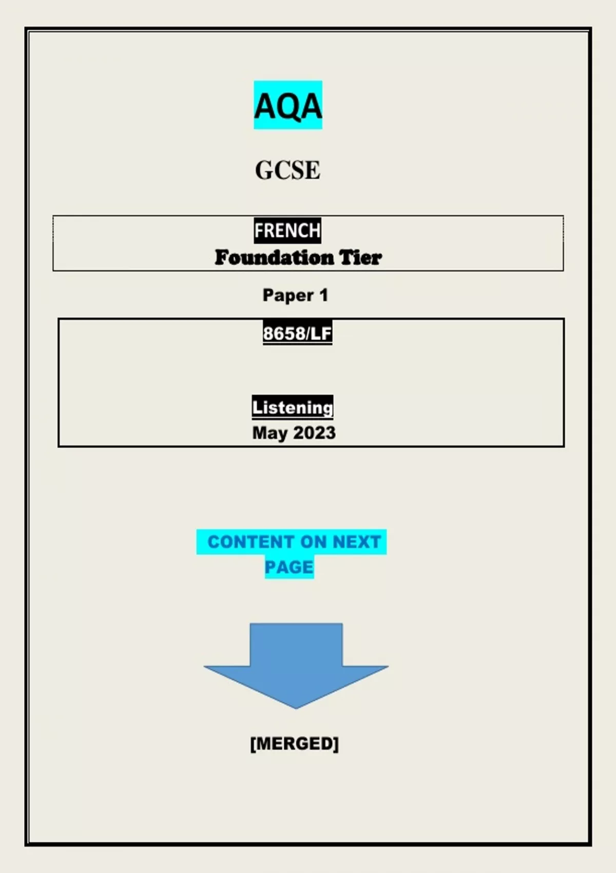 AQA GCSE FRENCH Foundation Tier Paper 1 8658/LF Listening||QUESTIONS & MARKING SCHEME MERGED||GRADED A+||
