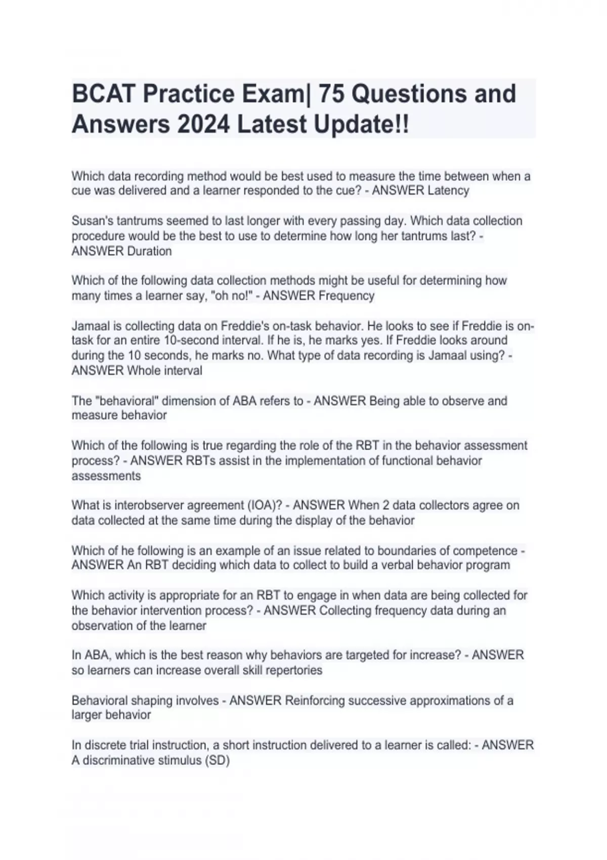 BCAT Practice Exam| 75 Questions and Answers 2024 Latest Update!!