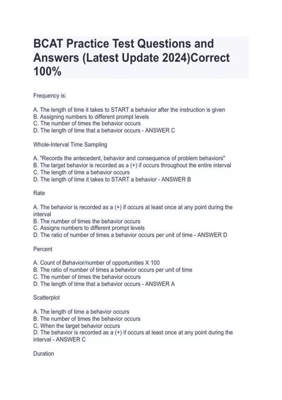 Frequency is: A. The length of time it takes to START a behavior after the instruction is given B. Assigning numbers to different prompt levels C. The number of times the behavior occurs D. The length of time that a behavior occurs - ANSWER C Whole-Interval Time Sampling A. "Records the antecedent, behavior and consequence of problem behaviors" B. The target behavior is recorded as a (+) if occurs throughout the entire interval C. The length of time a behavior occurs D. The length of time it takes to START a behavior - ANSWER B Rate A. The behavior is recorded as a (+) if occurs at least once at any point during the interval B. The number of times the behavior occurs C. Assigns numbers to different prompt levels D. The ratio of number of times a behavior occurs per unit of time - ANSWER D Percent A. Count of Behavior/number of opportunities X 100 B. The ratio of number of times a behavior occurs per unit of time C. The number of times the behavior occurs D. The length of time that a behavior occurs - ANSWER A Scatterplot A. The length of time a behavior occurs B. The number of times the behavior occurs C. When the target behavior occurs D. The behavior is recorded as a (+) if occurs at least once at any point during the interval - ANSWER C Duration A. The ratio of number of times a behavior occurs per unit of time B. The length of time it takes to START a behavior after the instruction is given" C. The number of times the behavior occurs D. The length of time a behavior occurs - ANSWER D Partial Interval Time Sampling A. The behavior is recorded as a (+) if occurs at least once at any point during the interval B. The target behavior is recorded as a (+) if occurs throughout the entire interval C. The time it takes to START a behavior after the instruction is given D. The number of times a behavior occurs - ANSWER A Scratching a bug bite is an example of negative reinforcement A. True