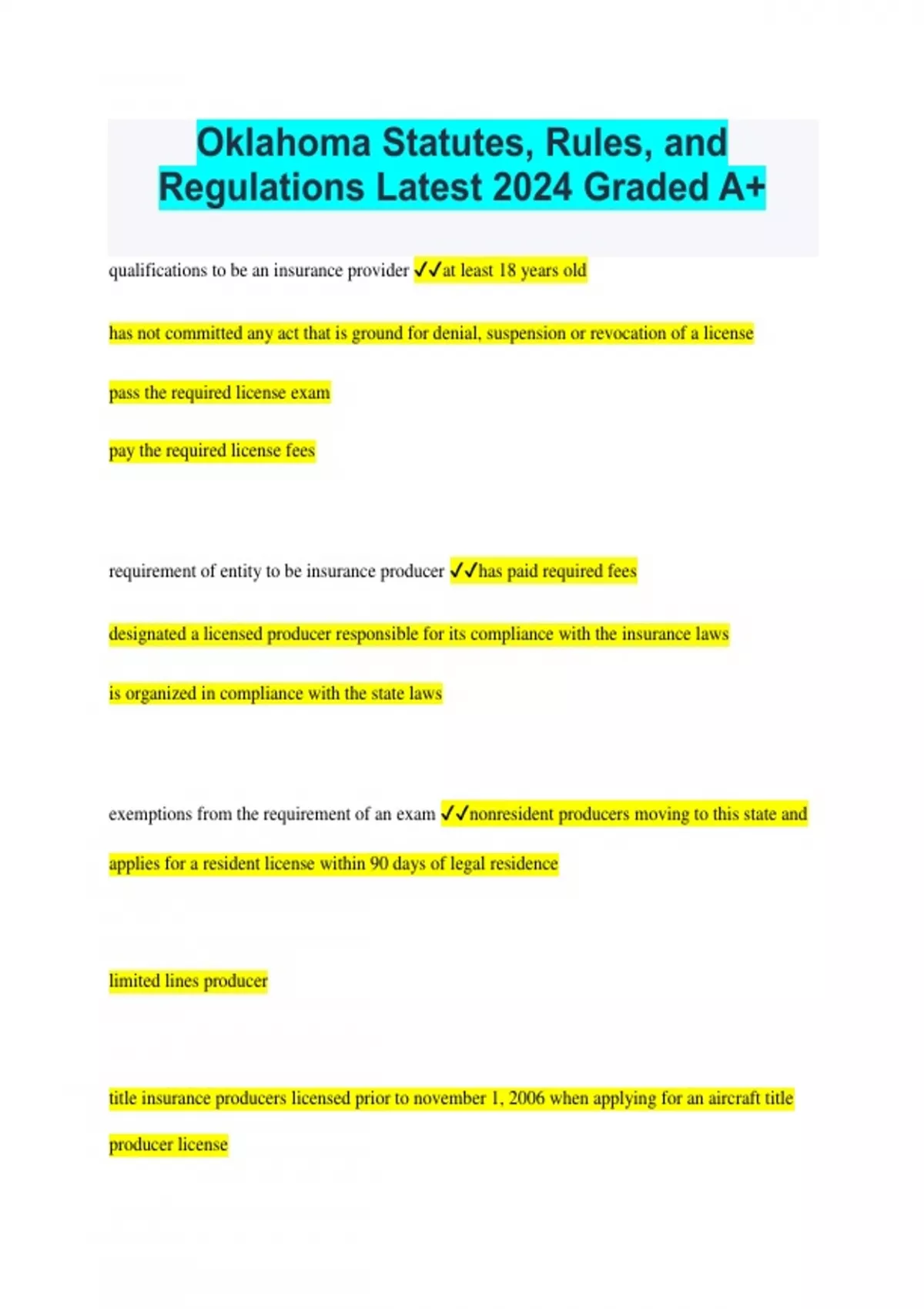 Oklahoma Statutes, Rules, and Regulations Latest 2024 Graded A+ qualifications to be an insurance provider at least 18 years old has not committed any act that is ground for denial, suspension or revocation of a license pass the required license exam pay the required license fees requirement of entity to be insurance producer has paid required fees designated a licensed producer responsible for its compliance with the insurance laws is organized in compliance with the state laws exemptions from the requirement of an exam nonresident producers moving to this state and applies for a resident license within 90 days of legal residence limited lines producer title insurance producers licensed prior to november 1, 2006 when applying for an aircraft title producer license licensing fees that are collected in advance 60$ for a producers license and general agent license biennially 40$ for a limited lines produce or customer service representatives license biennially 20$ for a temporary producers license $100 biennially for a surplus lines brokers license duplicate license fees (half amt of original license fee) late application fees (doubt amount of license fee) renewal fees for all licenses (equal to initial fee) producer person licensed to sell, solicit or negotiate insurance. synonymous with insurance agent consultant individual or entity that offers advice, counsel or service with respect to benefits, advantages, disadvantages of an insurance contract for a fee qualifications for consultant been an agent for 3 years not legal to be consultant and agent at the same time license is valid for 24 months and is renewed biennially an agreement outlining the nature of the work to be performed must be signed by both the consultant and client and copies must be kept for 3 years limited lines producer individual or partnership or corporation who is authorized by the commissioner to solicit contracts for a particular line of insurance. limited lines of insurance include but are not limited to credit insurance, crop insurance, travel insurance, baggage insurance and surety insurance managing general agent individual, partnership, or entity that is appointed to supervise the business of one or more insurers in oklahoma. have the authority to appoint and terminate agents for the insurer resident producer domiciled in the state and duly licensed by the oklahoma insurance department nonresident producer individual who is a resident agent in a state other than oklahoma. can be licensed as an insurance agent if the oklahoma licensing requirements are met, as long as the home state of the agent gives oklahoma residents the same privilege (reciprocity) return of license any licensed individual who no longer maintains residency in this state must return the insurance license to the commissioner by personal delivery or mail with return receipt, no longer than 10 days after terminating residency. temporary license commissioner may issue a temporary agent license for a max period of 180 days without requiring a written exam under certain circumstances. a temporary license cannot continue if the business is sold, or if the applicant fails the written exam. the commissioner may renew the temporary license once for good cause maintenance producers license remain in effect unless suspended or revoked as long as the education requirements are met by the biennially due date. producers