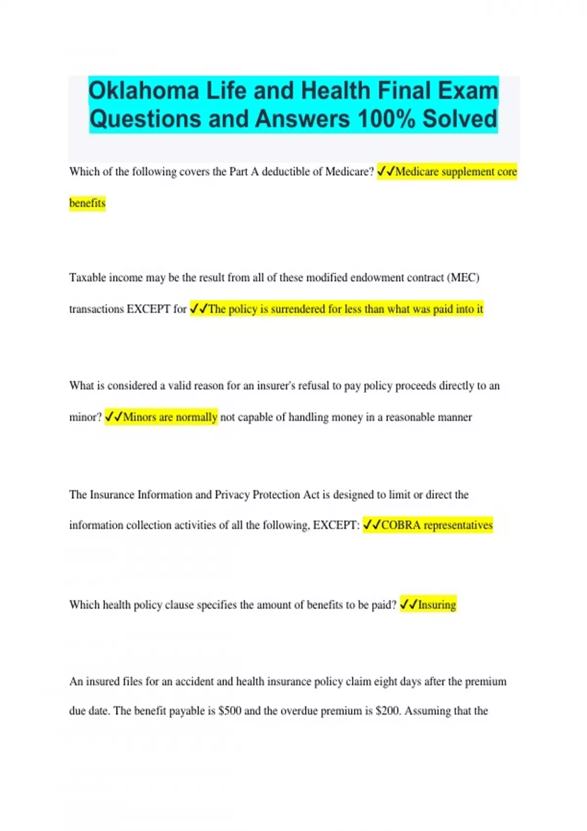 Oklahoma Life and Health Final Exam Questions and Answers 100% Solved Which of the following covers the Part A deductible of Medicare? Medicare supplement core benefits Taxable income may be the result from all of these modified endowment contract (MEC) transactions EXCEPT for The policy is surrendered for less than what was paid into it What is considered a valid reason for an insurer's refusal to pay policy proceeds directly to an minor? Minors are normally not capable of handling money in a reasonable manner The Insurance Information and Privacy Protection Act is designed to limit or direct the information collection activities of all the following, EXCEPT: COBRA representatives Which health policy clause specifies the amount of benefits to be paid? Insuring An insured files for an accident and health insurance policy claim eight days after the premium due date. The benefit payable is $500 and the overdue premium is $200. Assuming that the policy pays on a first-dollar basis and contains the unpaid premium provision, how much will the insurer pay? $300 A producer may be disciplined by the Commissioner for which of the following actions? Misappropriation of premium funds When would evidence of insurability be required for a person already covered with a variable universal life policy? When the death benefit is increased Which of the following provisions allows an insured or the insurer to terminate the policy? Cancelable provision How long must a life insurance policy be in effect before the policyowner may use the nonforfeiture provision? 3 years Under an adjustable life insurance policy, which of the following may NOT be changed without further underwriting? The person insured James is covered with health insurance by two different insurers. The "insurance with other insurers" provision in an individual health insurance policy allows an insurer to pay benefits to the insured on a pro-rata basis when The insurer was not notified prior to the claim that the insured has other health coverage What is guaranteed cash value of a whole life insurance policy when the insured turns 65 years old? Less than the policy's face amount An annuity's accumulation period may Continues after the purchase payments stop Which statement is NOT true regarding health insurance policies that provide limited benefits? Only persons under the age of 65 are eligible If a new policy is replacing an existing one the insured is given the right to return for a full refund of at least ____ days after policy delivery 20 After the initial enrollment period for Medicare Part B has expired, when may an individual purchase again? January through March of each year