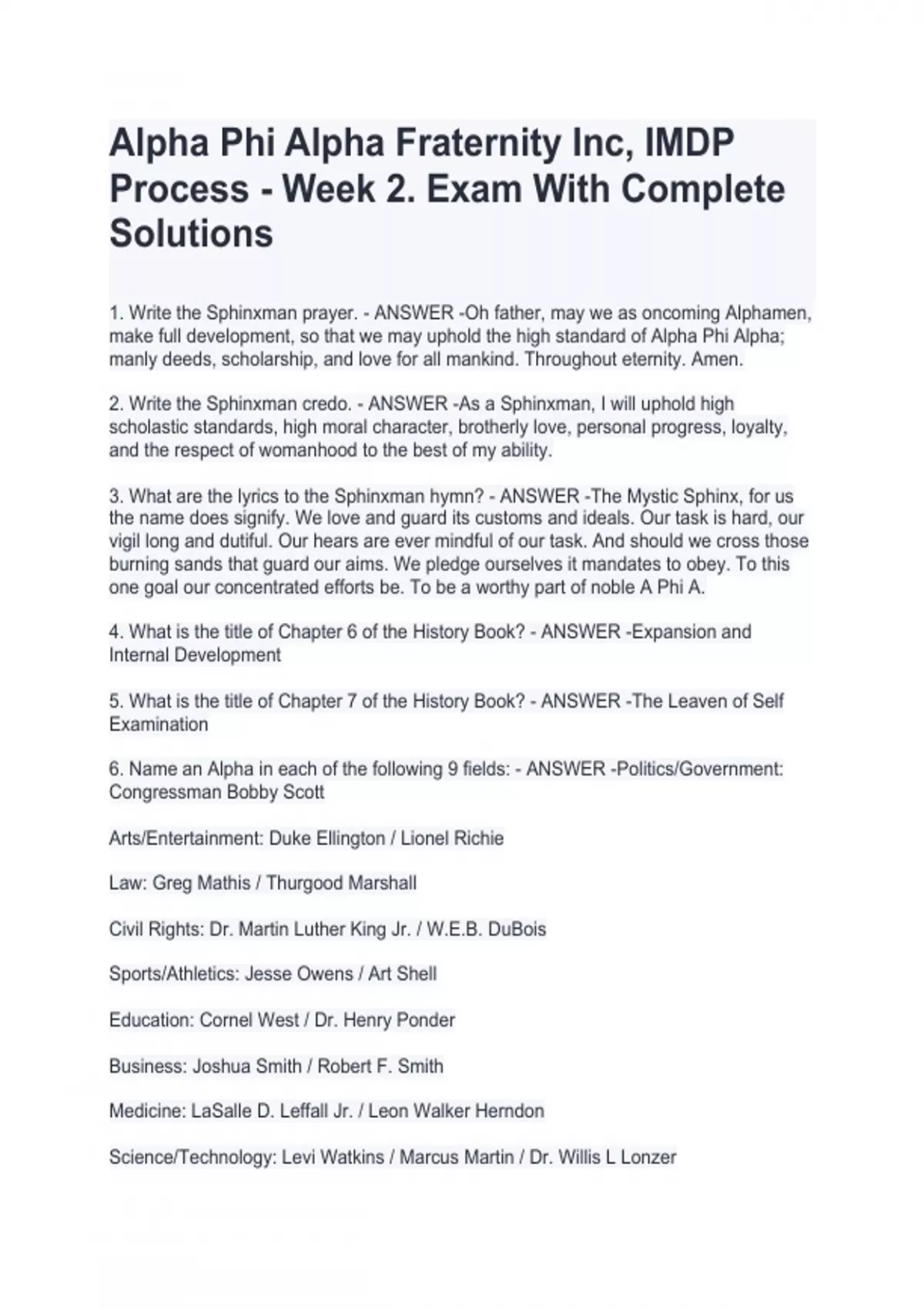 2. Write the Sphinxman credo. - ANSWER -As a Sphinxman, I will uphold high scholastic standards, high moral character, brotherly love, personal progress, loyalty, and the respect of womanhood to the best of my ability. 3. What are the lyrics to the Sphinxman hymn? - ANSWER -The Mystic Sphinx, for us the name does signify. We love and guard its customs and ideals. Our task is hard, our vigil long and dutiful. Our hears are ever mindful of our task. And should we cross those burning sands that guard our aims. We pledge ourselves it mandates to obey. To this one goal our concentrated efforts be. To be a worthy part of noble A Phi A. 4. What is the title of Chapter 6 of the History Book? - ANSWER -Expansion and Internal Development 5. What is the title of Chapter 7 of the History Book? - ANSWER -The Leaven of Self Examination 6. Name an Alpha in each of the following 9 fields: - ANSWER -Politics/Government: Congressman Bobby Scott Arts/Entertainment: Duke Ellington / Lionel Richie Law: Greg Mathis / Thurgood Marshall Civil Rights: Dr. Martin Luther King Jr. / W.E.B. DuBois Sports/Athletics: Jesse Owens / Art Shell Education: Cornel West / Dr. Henry Ponder Business: Joshua Smith / Robert F. Smith Medicine: LaSalle D. Leffall Jr. / Leon Walker Herndon Science/Technology: Levi Watkins / Marcus Martin / Dr. Willis L Lonzer