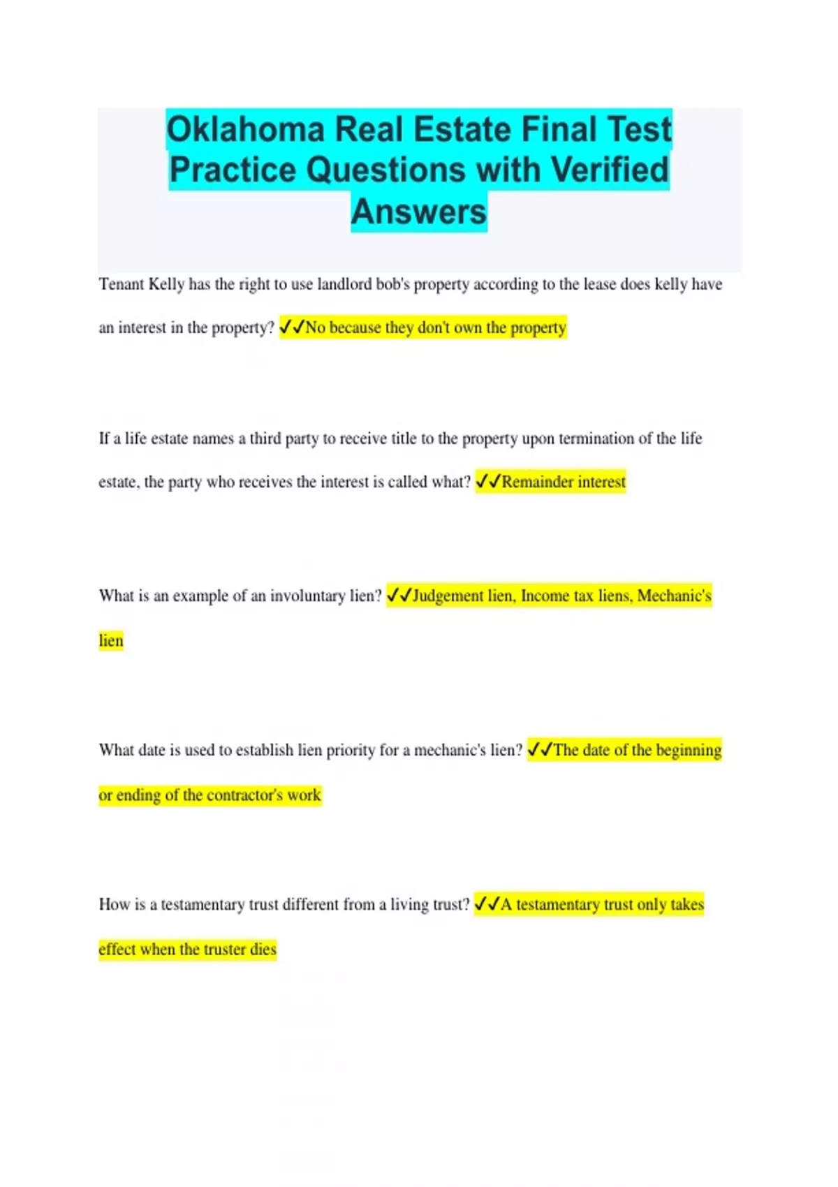 Oklahoma Real Estate Final Test Practice Questions with Verified Answers