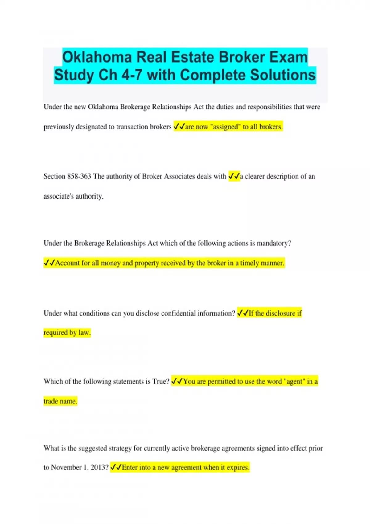 Oklahoma Real Estate Broker Exam Study Ch 4 -7 with Complete Solutions Under the new Oklahoma Brokerage Relationships Act the duties and responsibilities that were previously designated to transaction brokers ✔✔are now "assigned" to all brokers. Section 858 -363 The authority of Broker Associates deals with ✔✔a clearer description of an associate's authority. Under the Brokerage Relationships Act which of the following actions is mandatory? ✔✔Account for all money and property received by the broker in a timely manner. Under what conditions can you disclose confidential information? ✔✔If the disclosure if required by law. Which of the following statements is True? ✔✔You are permitted to use the word "agent" in a trade name. What is the suggested strategy for currently active brokerage agreements signed into effect prior to November 1, 2013? ✔✔Enter into a new agreement when it expires. Which of the following broker actions converts a customer into a client? ✔✔Entering into a listing agreement. A seller's net sheet is best defined as a tool that is used to help ✔✔a property owner with a reasonable estimate of costs and net proceeds from the sale of the property. The term "transaction broker" has been removed from ✔✔the paragraph on vicarious liability. What are the duties of broker following termination, expiration, or completion of performance? ✔✔To account for all monies and property relating to the transaction and maintain confidentiality. After November 1, 2013 ✔✔if you use the terms "single party broker" and "transaction broker," you should clearly define the usage, since it is no longer defined in the law. When must a firm inform all parties in a transaction when providing services to both parties? ✔✔Prior to the parties signing a contract to purchase, lease, option or exchange real estate.